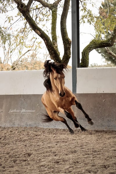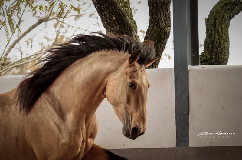 Ce jeune étalon Lusitanien a été monté seulement depuis quelques semaines, mais il fait déjà preuve d’un comportement exceptionnel. Il se montre très coopératif avec le cavalier, connaît les bases et commence également à faire ses premières sorties en extérieur. Au sol, il est extrêmement amical, agréable à manipuler et toujours attentif à faire de son mieux. Santo Isidro séduit non seulement par son caractère, mais aussi par sa belle robe : c’est un beau falbe de 1,55 m au garrot, avec une taille estimée à 1,58 m, pratique, sportif et idéal également pour la Working Equitation. Son galop, particulièrement remarquable, montre déjà beaucoup d’équilibre, une tendance à monter et un potentiel évident pour sa future formation. Il a grandi sur 600 hectares, au sein d’un troupeau de jeunes étalons, dans un environnement harmonieux au magnifique centre Jupiter Classical Dressage, qui appartient également à ce joli garçon. Il peut être visité à tout moment. Si vous cherchez un jeune étalon Lusitanien sincère, avec un bon caractère et un bel avenir, ne manquez pas l’occasion de rencontrer Santo Isidro.