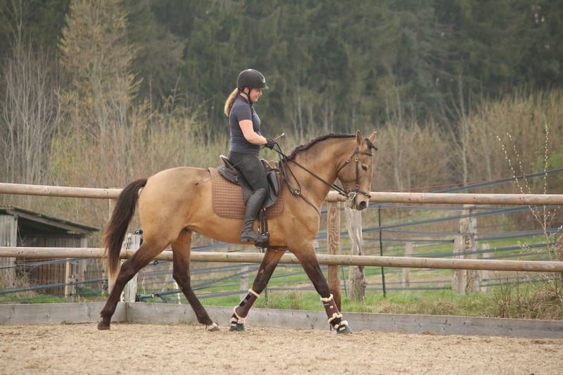 Salgado ist ein derzeit 162cm großer PSL Hengst in der Farbe Buckskin. Er hat unglaublich viel Ausdruck und zieht die Blicke auf sich. Mit grossrahmigen Bewegungen und schon jetzt einer schönen bergauf Galoppade macht er im Viereck eine gute Figur und wird dort sicher glänzen. Auch die ersten Male auf dem Working Equitation Platz hat er sich talentiert gezeigt. Er ist ein ruhiges und dem Menschen sehr zugewandtes Pferd, wie die Lusitanos eben so sind! Er ist jetzt seit ca 5 Monaten unterm Sattel. Wir haben ihn schonend mit Pad und Gebisslos angeritten. Jetzt geht es an die Arbeit. Er hat viel Spaß an der Arbeit und ist fleißig! Er steht bei uns derzeit 24/7 draußen und steht mit Wallachen und einem Ponyhengst zusammen. Er lässt sich verladen und läuft barhuf. Bei weiteren Fragen meldet euch gerne bei mir. Videos folgen in Kürze!