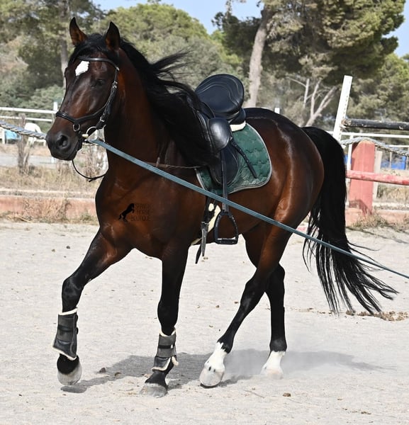 Este semental Pura Sangre Lusitano, nacido en 2021 y con Livro Azul (documentación original de los Lusitanos de pura raza de Portugal), es un verdadero tesoro de buen corazón. Solo hay que mirar sus suaves ojos y se siente de inmediato lo cariñoso y afectuoso que es. A pesar de su tierna edad, es increíblemente equilibrado y tranquilo. En cada momento, quiere agradar y hacer todo bien. Además, es realmente intrépido y un verdadero caballero, ya sea en presencia de yeguas o de otros sementales. El joven se monta con un bocado de agua de doble quiebro y se mueve sin problemas descalzo. Ya está aprendiendo a estirarse bien y acepta el contacto con la mano de forma adecuada, siendo fácil de montar. Su movimiento es definitivamente interesante para los jinetes de doma. Su crianza también ha sido ideal, ya que ha podido ser simplemente un caballo en un grupo de sementales, con más de 30 potros en muchas hectáreas de terreno. Esto se nota de inmediato, ya que tiene una mente muy clara, es intrépido, abierto y suave. Existe la opción de castración en el lugar, aunque definitivamente no tiene comportamientos de semental. Actualmente mide 165 cm y definitivamente seguirá creciendo en altura y proporciones. Con su carácter impecable, con un poco más de entrenamiento se convertirá en un caballo ideal para toda la familia. También se cuenta con un test negativo de piroplasmosis (libre de piro). El precio por su calidad es absolutamente justo. Actualmente se encuentra en Mallorca. Videos y pedigree disponibles a solicitud. Con gusto organizaré una revisión veterinaria, castración, entrenamiento, transporte o incluso su viaje, en caso de que desee venir a verlo personalmente. Para más detalles, puede consultar mi página o hablar conmigo. ¡Saludos desde España!