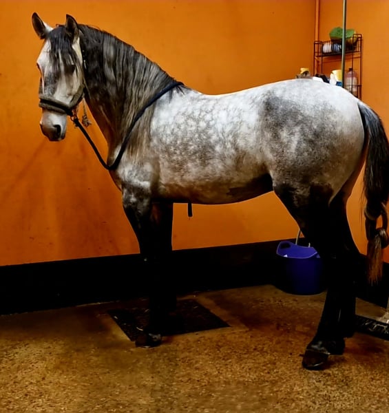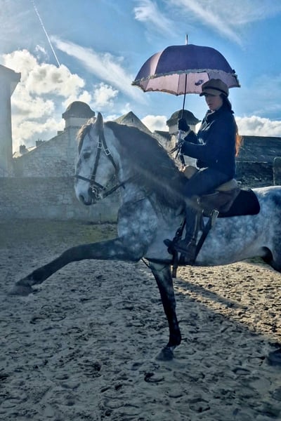 Cheval lusitanien pleins papiers entier , choisi et importé de l'élevage " Palha " à Lisbonne ( Portugal) . Né en 2019, 1m58 De la force, qualité de galop et équilibre ++ Cheval monté à une main. Léger et maniable. Sort en extérieur seul et accompagné, va dans l'eau, passe partout. Bien dressé, pas espagnol, passage, révérence. Expérience en spectacle et en tournage pour le cinéma. Cheval prêt pour la guerre.