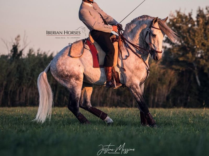 We present an outstanding Lusitano stallion, born in 2018 and standing at 158 cm, who combines elegance, functionality, and an exceptional temperament. Currently trained at Grand Prix level, this horse shows great maturity and balance both physically and mentally, making him the ideal partner for riders seeking quality, reliability, and remarkable versatility. Under saddle, he is extremely easy and comfortable to ride, with just the right amount of sensitivity and an excellent willingness to work. His calm and cooperative nature makes him a real pleasure to ride, whether by professionals or amateur riders looking for a noble and safe horse. In daily handling, he remains equally easy and respectful, always showing a serene and reliable attitude. His movements are expressive, elastic, and correct, featuring a supple trot and balanced canter that reflect the high quality typical of top-level Lusitano horses. In addition to his dressage training, this stallion is also suitable for Working Equitation or Doma Vaquera, thanks to his agility, obedience, and great adaptability. He comes with available X-rays confirming his excellent health, offering full transparency and confidence for his future owner. In summary, a complete, versatile, and kind-natured horse—ideal to enjoy across multiple equestrian disciplines.