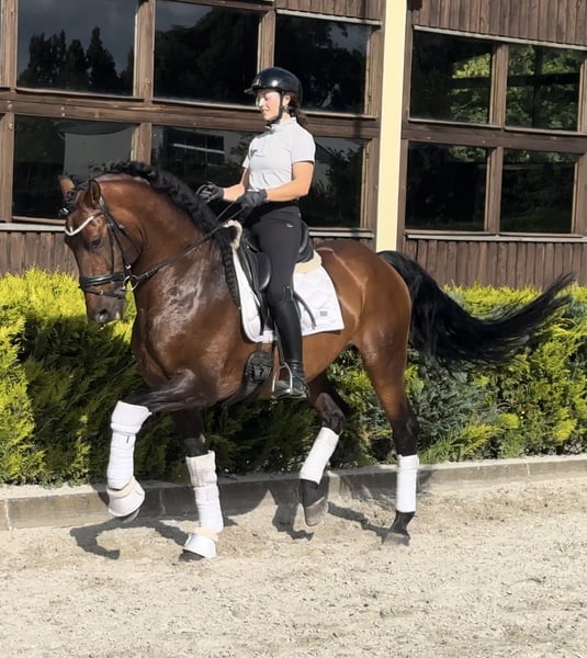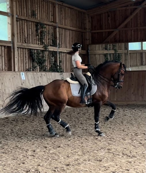 Duende est un hongre de 8 ans avec un père PSL et une mère PRE provenant de l'élevage réputé "Bohorquez" en Espagne. Ce qui le distingue des autres chevaux ibériques, c'est qu'il a été élevé pour la tauromachie à cheval. Il est élastique, rapide, extrêmement attentif et toujours en équilibre, prêt à exécuter vos ordres. Duende a un caractère exceptionnel, un débutant peut le monter et galoper sans problème (vidéos disponibles). Dans le champ, il est calme, c'est un cheval qui veut toujours bien faire et qui donne 300 % à chaque montée. Il a un grand talent pour la piaffe, la passage et les exercices d'extension et de rassemblé. C'est un cheval maître qui vous apprend de manière sensible à donner les aides et vous permet également de faire des erreurs. Il est plutôt tempétueux que paresseux, mais sans être excessivement électrique, il réagit rapidement aux aides, avance devant la jambe et vous appelle toujours lorsque vous passez devant son box. Il n'a que 8 ans et a une tête exceptionnelle, un cheval dont on peut profiter pendant de nombreuses années. Il est très doux dans la main, effectue les exercices avec un bridon, est très facile à manipuler, n'a pas de caractère de hongre et dispose de bonnes radiographies de l'ensemble du corps. Vidéos et plus d'informations sur demande.