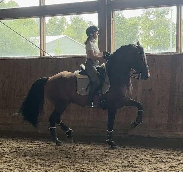 Duende es un semental de 8 años, hijo de un padre PSL y de una madre PRE, procedente de la famosa cabaña "Bohorquez" en España. Lo que lo distingue de otros caballos ibéricos es que fue criado para la corrida a caballo. Es elástico, rápido, extremadamente atento y siempre equilibrado, listo para ejecutar sus órdenes. Duende tiene un carácter excepcional; un jinete principiante puede montarlo y galopar sin problemas (videos disponibles). En el campo, es tranquilo, es un caballo que quiere hacer las cosas bien y da el 300 % en cada monta. Tiene una gran talento para piaffe, passage y movimientos de extensión y recolección. Es un caballo de talento que te enseña con sensibilidad cómo colocar las ayudas, permitiéndote cometer errores y aprender. Su carácter es más bien vivo que perezoso, pero sin ser excesivamente eléctrico; reacciona rápidamente a las ayudas, avanza con la pierna y siempre te llama cuando pasas por su box. Tiene solo 8 años y una cabeza excepcional, un caballo con el que podrás disfrutar durante muchos años. Es muy dócil en la mano, realiza ejercicios con brida de bocado, es muy fácil de manejar, no tiene carácter de semental y cuenta con buenas radiografías de todo el cuerpo. Videos y más información a solicitud.