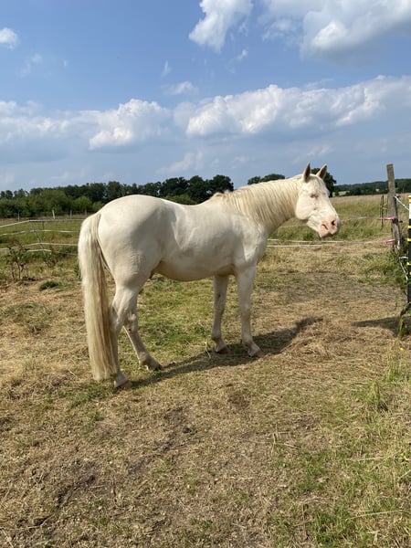 Reliable, relaxed Lusitano seeks a new sphere of activity. Aramis is trained in all basic gaits and masters all lateral movements as well as backing up. Short strides, canter on the outside, and Spanish walk started from the ground. First elevations on the hindquarters. He is loading-friendly, farrier-friendly, and well-mannered in handling. Not suitable for beginners and children. Better for ambitious leisure riders, advanced riders, academics, dressage riders, equestrian art, show riders, working equitation, or jumping. The horse wants to work and be developed, but remains calm, reliable, and relaxed in its work and does not bolt. He is also rather relaxed and calm in handling. A sensitive, willing to learn, attentive Lusitano. His character is honest, proud, reserved, majestic, and good-natured. This horse has not had any bad experiences in its life but can still react stallion-like and distrustfully. Typical Lusitano character.