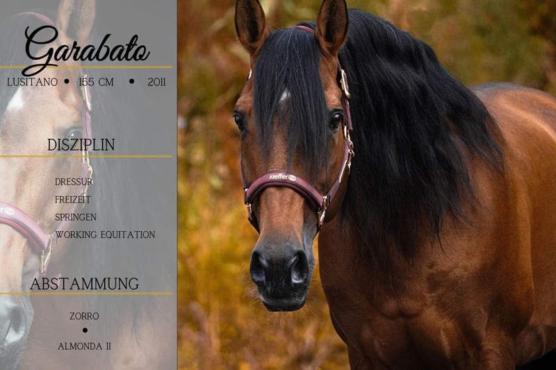 Garabato ist ein 2011 geborener Lusitano Wallach ca. 155 cm v. Zorro, Raxito x Lidador, Almonda II *Garabato* wunderschöner im hengsttyp stehender Wallach mit viel Ausstrahlung. Garabato ist gut ausgebildet und beherrscht zudem höhere Lektionen. Er eignet sich auch für Anfänger und ängstliche Reiter sowie Jugendliche. Ein Pferd mit dem der ambitionierte gute Reiter wie auch der schwache Reiter viel Freude hat. Im Gelände brav und cool, ob alleine oder in der Gruppe. Fremde Umgebungen meistert er auch cool. Er springt auch gerne mal über einen Baumstamm, kann den spanischen Schritt und liebt Bodenarbeit. Er springt fliegende Wechsel, geht Seitengänge du bietet auch die Pirouette an. Trotzdem ein Pferd mit dem auch einfach nur ohne Sattel reiten kann und viel Freude hat. Er hat super bequeme GGA. Gelassenheitstraining macht der super unerschrocken mit !!! SCHAUEN SIE SICH UNBEDINGT SEIN VIDEO AN !!! Im Umgang verschmust, kennt es sogar von Kindern umsorgt und geputzt zu werden. Ein Traumpferd durch und durch, ob Optik oder Charakter. Er bringt eine aktuelle große AKU mit. Ein aktuelles Video finden Sie hier in der Anzeige oder unter folgendem Link: https://www.youtube.com/watch?v=vNOf2MhawdE Pferdehandlung Dederichs – Ihr Partner für den Pferdekauf Kontakt & Erreichbarkeit: Anfragen bitte ausschließlich telefonisch unter 0173/9792139 Montag – Freitag: 09:00 – 18:00 Uhr Samstag: 09:00 – 15:00 Uhr Sonntag: Ruhetag Folgen Sie uns auf Social Media! Erleben Sie unseren Alltag mit den Verkaufspferden auf Instagram, TikTok & Facebook unter Pferdehandlung Dederichs Rabatt: Bei sofortiger Mitnahme Ihres neuen Traumpferdes erhalten Sie zwischen 5 %– 10 % Rabatt Probereiten & Vorführen: • Probereiten: 30 € pro Pferd (max. 2 Reiter), Betrag wird beim Kauf angerechnet • Feiertage: Proberitt 50 € • Vorführung durch unsere Bereiter: 25 € pro Pferd (Vorreiten, Bodenarbeit etc.) Ankaufsuntersuchung & Transport: • Viele unserer Pferde besitzen bereits eine AKU • Sie können selbstverständlich Ihren eigenen Tierarzt mitbringen • Gerne organisieren wir eine Untersuchung • Wir unterstützen Sie auch gerne beim Transport ins neue Zuhause Weitere Verkaufspferde: In unserem Stall stehen weitere Verkaufspferde, die noch nicht online sind. Falls Ihr Traumpferd noch nicht dabei ist, zögern Sie nicht, uns zu kontaktieren. Wichtige Hinweise: • Stockmaß-Angaben sind geschätzt und nicht exakt nachgemessen • Alle Beschreibungen sind subjektive Einschätzungen des Verkäufers und keine zugesicherten Eigenschaften Weitere Informationen finden Sie unter: www.Pferdehandlung-Dederichs.de
