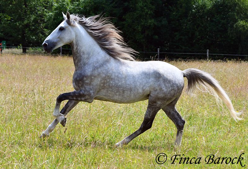 Rasse: PSL Name: Quartzo LF Geschlecht: Wallach Stockmaß: 162 cm Alter: 29.05.2020 Farbe: Schimmel Preis: 14.900 € Vater: Atrevido v. Iraque Mutter: Doninha II v. Rubi Quartzo, ist ein typvoller Lusitano mit freundlichem Charakter und sitzbequmen Bewegungen. Dazu ist er extrem verschmust und menschenbezogen. Neben seinem guten Gebäude und Charakter zeichnet er sich durch seine Rittigkeit und Lernbereitschaft aus. Seine Bergaufgaloppade ist besonders hervorzuheben, man fühlt sich als Reiter wie auf Wolken <3 Bei ihm unbekannten Sachen bleibt Quartzo eher stehen, lässt sich leicht überzeugen an dem neuem vorbeizugehen. Wasser findet er klasse, planschen in Pfützen ist für ihn ein echtes Highlight! Quartzo lernt zur Zeit Schritt - Galopp Übergänge unter dem Sattel. Schulterherein und Travers vom Boden klappen bereits sehr gut, Traversale angefangen. Unter dem Sattel ebenso angefangen. Span. Schritt erarbeiten wir akutell auch vom Boden aus und er zeigt bereits sehr schöne einzelne hohe Schritte. Insgesamt erleben wir Quartzo als sehr souveränes, zugewandtes Pferd welches sich über neue Aufgaben freut. Und dieser Galopp.... <3 Freiarbeit liebt er, genauso wie das Gelände. Insgesamt ist er sehr vielseitig. Egal ob Arbeit an der Hand, Doppellonge, Gelände als Handpferd oder auch Gelände mit Handpferd. Quartzo ist feinfühlig und wünscht einen klaren Reiter. Er ist somit kein Pferd für Reiteranfänger. Er möchte immer gefallen und ist extrem bemüht und möchte alles und immer richtig machen. Fragt man 3 mal an der selben stelle die selbe Lektion, so nimmt er diese schnell vorweg. Ein hochgenuss für den feinen Reiter, welcher ein reaktionsschnelles, kopfklares Pferd wünscht. Quartzo ist Herdenhaltung gewöhnt, zeigt sich hier mit sehr unterschiedlichen Pferden verträglich. inkl. klinischer tierärztlicher Untersuchung und Röntgenbildern Kontakt: Finca Barock, Tel. 0173-696 31 81, 56291 Wiebelsheim