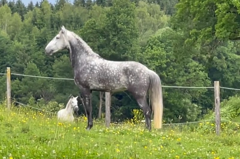 Verkaufe eleganten Lusitanos-Wallach – Rappschimmel, geb. 2020 Zum Verkauf steht ein wunderschöner Lusitanos-Wallach, geboren im Jahr 2020. Mit seinem beeindruckenden Stockmaß von 168 cm vereint er klassische Eleganz und athletische Qualität. Der Rappschimmel besticht durch sein edles Erscheinungsbild und seine ausdrucksstarke Präsenz. Vielseitige Grundlagen sing gelegt: Gelände, Handpferdereiten, Freiarbeit, Gymnastiksprünge, workinghindernisse, Seitengänge, erste Piaffetritte begonnen. Er ist perfekt erzogen und super freundlich, auch in der Herde. Röntgenbilder vorhanden. Der Wallach ist gesund, gepflegt und bereit für neue Herausforderungen – sei es im Freizeitbereich, der Dressur oder im working Equitation Sport. Bei Interesse und für weitere Informationen stehe ich Ihnen gerne zur Verfügung. Besichtigung und Probereiten nach Vereinbarung möglich.