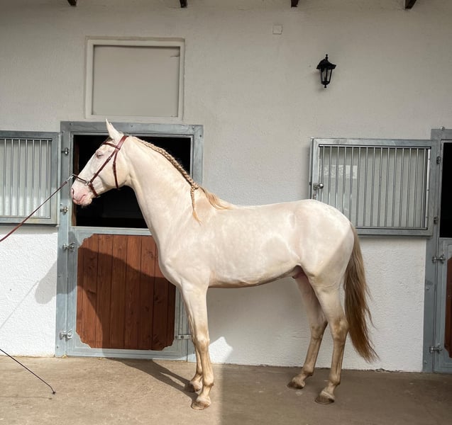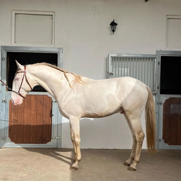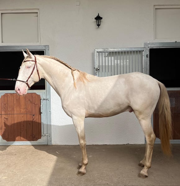 With a heavy heart, we are selling our beautiful, purebred Lusitano gelding Orpheu (*March 25, 2018). His special color "Perlino" (with double cream gene) gives him a very unique appearance and made him very interesting for us in terms of breeding. Due to Orpheu's sensitive nature, the transition between being blanketed and being ridden was challenging for him, so we decided to let him rest last autumn. Since then, he has been calming down and making great progress under saddle. Recently, he even went on his first rides across fields and meadows!! Orpheu is certainly not a beginner's horse - the new partner should be very experienced in riding. Orpheu is currently at a farm in Odenwald (near Groß-Umstadt) and is in full training with a well-known Portuguese trainer. More photos, the pedigree, etc. can be viewed on our website https://www.lusitanos-zucht.de/ or on Instagram lusitanozucht.schonharting. If interested, an appointment for a meet-and-greet can be arranged starting from May 1st.