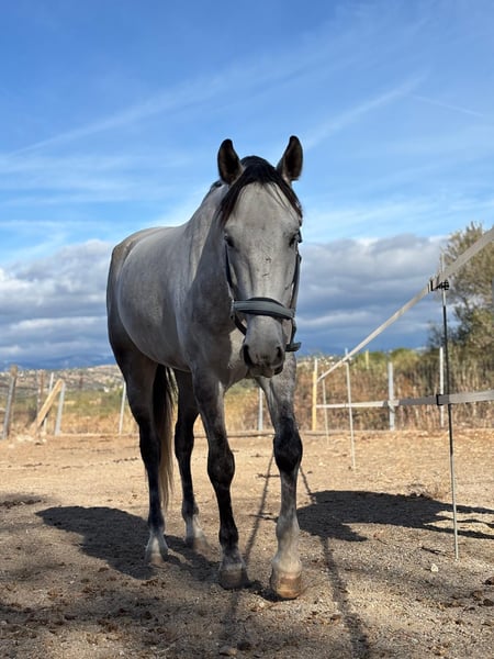 **Lusitano castrado, entrenado en doma Caballo Lusitano, castrado, nacido en 2018, con facilidad para aprender nuevos ejercicios y mucha energia. Con una alzada de aproximadamente 165 cm, este tordo rodado no pasa desapercibido en pista. Este ejemplar ha sido entrenado en doma clásica, demostrando una actitud asustadiza pero inteligente, por lo que no es apto para jinetes sin experiencia en el deporte. Su temperamento en box/prado es equilibrado y confiable. Salud apta para el deporte, consultar para mas información