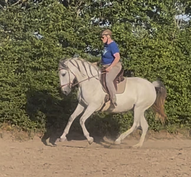 Une jument portugaise très typée, au style très baroque, avec beaucoup de profondeur de poitrine et des mouvements amples et dynamiques, qui font oublier qu’elle ne mesure que 1,59 m. Elle est très fière et dotée d’un caractère fort, avec beaucoup de puissance, sans être nerveuse. Étant donné mon âge, cette énergie deviendra trop importante pour moi à long terme (je ne suis pas toute jeune), je recherche donc une cavalière ou un cavalier plus jeune, qui prendra plaisir à développer cette énergie pour lui-même. Li est solidement dressée selon les principes classiques, maîtrise toutes les figures de côté en pas et en trot, piaffe et passage, en revanche, le galop n’est pas encore totalement développé. Elle vit en paddock, son comportement social est impeccable, mais comme elle est plutôt dominante, je pourrais également envisager qu’elle soit satisfaite d’une stalle paddock avec un accès à l’extérieur toute la journée.