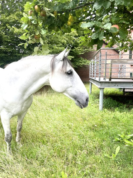 Extrem typvolle , sehr barocke Lusitanostute mit viel Gurtentiefe und herausragenden schwungvollen großen Bewegungen, die einen vergessen lassen, dass sie nur 1,59 Stockmass hat. Sie ist sehr stolz und charakterstark mit sehr viel Power ohne aber zappelig zu sein. Da mir aus Altersgründen auf Dauer diese Energie zu viel sein wird ( Frau wird nicht jünger) suche ich jetzt eine jüngere Reiter/in , die Spass daran hat, diese Energie für sich zu entwickeln. Li ist nach klassischen Grundsätzen solide ausgebildet, beherrscht alle Seitengänge in Schritt und Trab, piaffiert und passagiert, der Galopp hingegen ist noch nicht so weit ausgebaut. Sie lebt im Offenstall, ihr Sozialverhalten ist tadellos, da sie aber rangniedrig ist, könnte ich mir auch vorstellen, dass sie mit einer Paddockbox und ganztägigem Auslauf zufrieden ist.