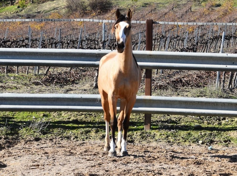 Caractère doux, un peu sauvage, en pâture avec d'autres juments, de petite taille, couleur particulière, bons mouvements. www.elegante-andalusier.com