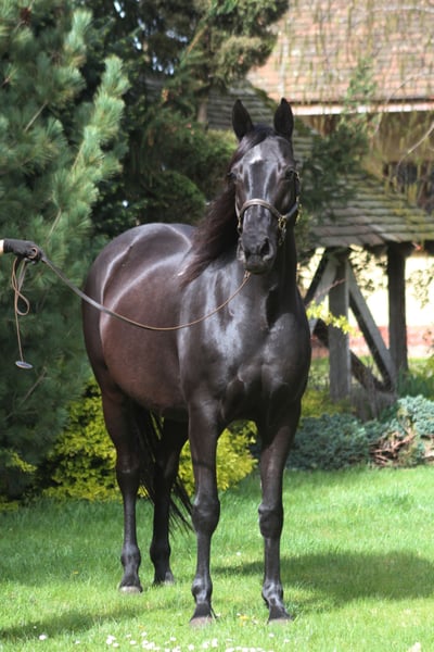 We are looking for a new home for our lovely angloarabian mare. Homozygous black confirmed by genetic testing, bred by SK Walewice state Stud from the best Anglo-Arabian lines. In the pedigree, famous Efekt, Veritas, Vidoc, Huzar, Jalienny AA , english thouroughbreds , highly valued and recognized in the sport of eventing and show jumping. A very feminine mare, beautiful with great flexible and extensive movement. Broken in at the age of 3.5 years, then she was a breeding mare with us Now is beening retrained under the saddle. Very good elastic gaits, soft to ride. The mare is healthy, not exploited. Correct conformation, straight legs and perfect hoofs. She absorbs feed very well, a fantastic caring mother, she gave birth to only homozygous blacks with us. The mare has a lovely , pro-human character, which she passes on to her offspring. Trouble-free and very polite in everyday handling, ultrasound examination, vet, blacksmith, etc. Has a breeding license, registered in the main studbook. Very well cared, vaccinated, dewormed. Every day on green big fields with the herd. Price + 8% VAT Located 50 km from PL/D border. Best contact is via WhatsApp + 48 513 179 245 Transport can be arranged.