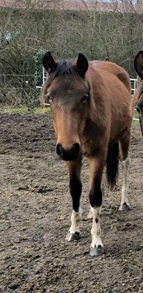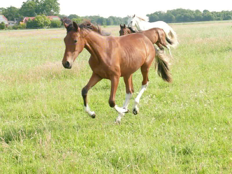 Agasche bvom Hartungshof , geb.am: 07.05.2024 ist eine besonders liebe, nette und unkomplizierte junge Dame, sie verfügt sehr elastische Bewegungen und eine für ein Gangpferd sehr gut gesprungene Galoppade. Ihre Gangveranlagung ist sowohl die Marcha Batida, wie auch die Marcha Picada. Agasche hat wie alle unsere Fohlen das Fohlen ABC gelernt und zeigt sich neugierig und interessiert an allem, was rundum passiert. Genetisch ist Agasche ein Braunschecke, hat aber lediglich 4 weiße Beine und einen schwarz / weiß "karierten" Schweif. Z.Zt. ist sie eine typische 1,5 Jährige bei der so einiges noch nicht so recht zusammen passt, ich bin mir aber sicher, dass sie sich zu einer harmonischen Stute weiter entwickeln wird. Sie lebt mit ca. 20 anderen Pferden zwischen 6 Monate und 29 Jahre alt in einer gemischten Gruppe, wo das Jungvolk spielt und die Erwachsenen wertvolle Erziehungsarbeit leisten. Alle unsere Pferde bekommen alle 7 Wochen Hufkorrektur, werden regelmäßig entwurmt und sind gegen Tetanus, Influenza und Herpes geimpft. Auch von ihr gibt es nicht so viele Bilder, weil ich 2024 und 2025 gesundheitlich heftig angeschlagen war.