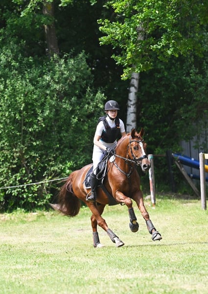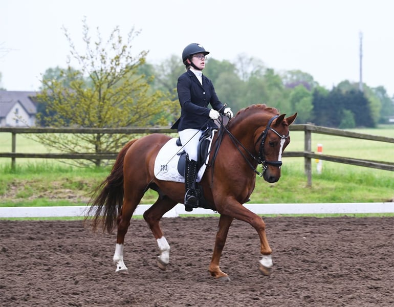Dieser wunderschöne Hengst besticht durch sein ausgeglichenes Temperament, seine lockeren Bewegungen und einen raumgreifenden Schritt, der regelmäßig mit 9er Noten bewertet wird.