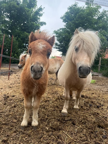 A beautiful, robust, self-bred mare from our family breeding program. Halter-trained, handleable by children, hoof trimming with a rasp possible, traffic-safe, familiar with dogs, cats, mice – all everyday sounds – never ill, no eczema, no laminitis. She is currently in our foal-rearing herd, living in a small mixed group in an open stable. Pandora has a calm, friendly temperament – she easily follows others and always behaves thoughtfully and very well-behaved. She has a strong, solid foundation and would certainly make a good broodmare. The second-to-last picture shows her mother, Many Minis Panama – a state premium mare. The last picture features her sire, Fleetwood Ley Piano – a South German premium stallion. More pictures and videos are available upon request or at: www.km-minishetlands.de https://www.facebook.com/kmstallions.de/
