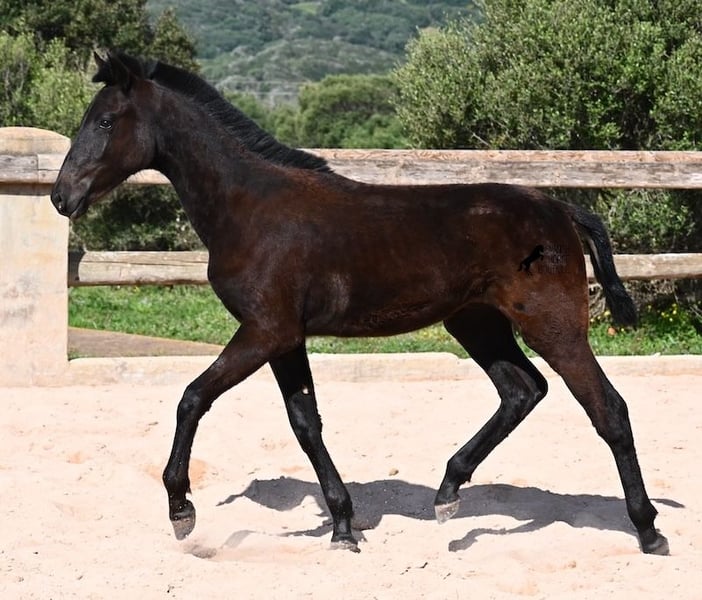 This purebred Menorquin stallion, born in 2024, is a truly adorable little guy. He dances elegantly across the arena, and even though he is currently incredibly sweet, he is sure to become an elegant representative of his breed! Thus, one can currently enjoy this cutie and at the same time look forward to what he will become. With his movement and very compact conformation, he will certainly be an ideal candidate for Working Equitation, Western riding, and of course as a leisure horse. He enjoys his foal life in the herd, is kept in a robust environment 24 hours a day on hard ground, and happily marches many kilometers with his buddies. As such, he is robust, has good hoof quality, and clear legs. In his veins flow old bloodlines of the Menorquin, which is reflected in his subtle knee movement, and he is likely not to be too tall—his expected final height is around 156 cm. He is halter-trained and ready to embark on the big journey—hopefully to you! He is currently located in Menorca! Videos and pedigree available upon request. I would be happy to organize an inspection, transport, or your journey should you wish to come see him in person. Details can be found on my page or in conversation. Greetings from Spain!