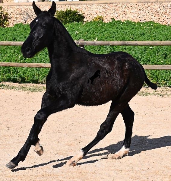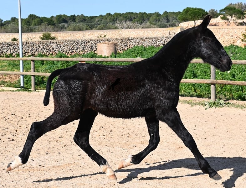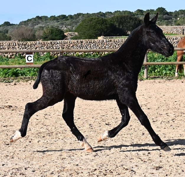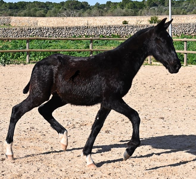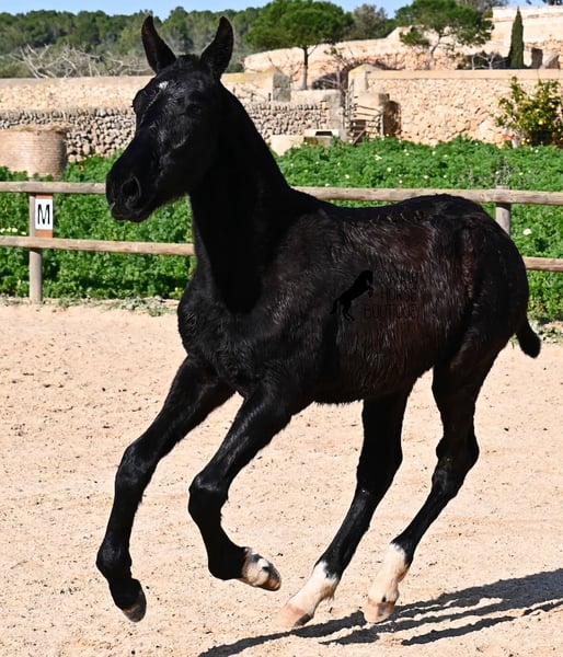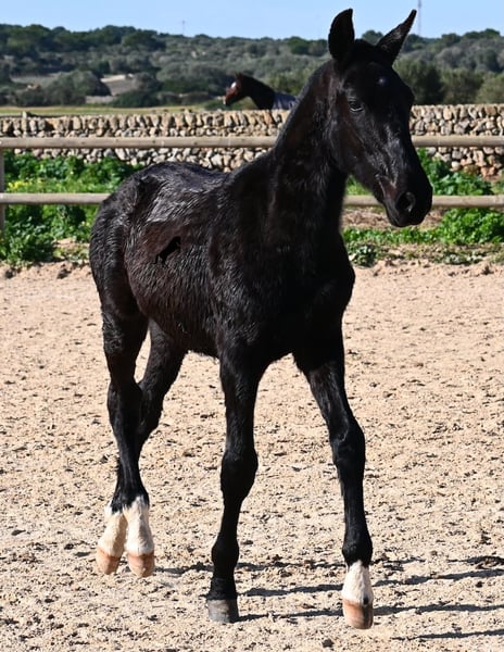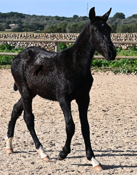 Este potro de raza pura, nacido en la primavera de 2025, tiene una apariencia muy especial. Con tres calcetas blancas y una pequeña estrella, destaca de inmediato en el grupo, y su patrón de manchas es hoy en día una rareza. Proviene de líneas antiguas muy puras del Menorquín, que cada vez se pierden más, y es admirable que algunos criadores intenten preservarlas. Sin embargo, en el pasado, había aún más ejemplares con marcas blancas en la raza, y esto claramente se refleja en él ;) Según las regulaciones actuales de selección, no podrá ser aprobado como semental debido a su cantidad de blanco, pero será un caballo de doma o de tiro maravilloso. Tiene movimientos elegantes, es muy flexible y ágil, lo que seguramente también lo hará interesante para la Working Equitation en el futuro. Como corresponde a un potro joven, su rutina diaria consiste en jugar en la manada, crecer y desarrollarse ;) En muchos hectáreas de tierra, está al aire libre las 24 horas del día, con cualquier clima, por lo que es un caballo resistente, con patas firmes, mente clara y cuerpo fuerte. Es muy curioso, ha aprendido a salir de la caja y tiene un sólido ABC del potro, que puede consultarse en cualquier momento. Su tamaño final esperado es de aproximadamente 1,60 m. Para quienes deseen adquirirlo más adelante, existe la opción de reservarle un lugar en la finca para su crianza. Videos y genealogía disponibles bajo petición. Su ubicación actual es Menorca. Con gusto puedo organizar una revisión de salud de potros (AKU), transporte o incluso su viaje, si decides venir personalmente a verlo. Para más detalles, puedes consultar mi página o contactarme directamente. Saludos desde España