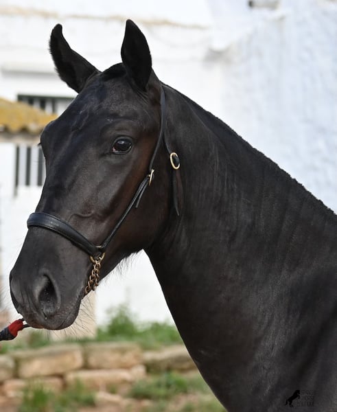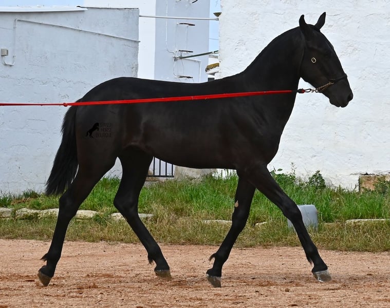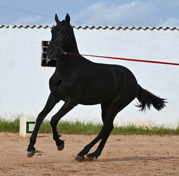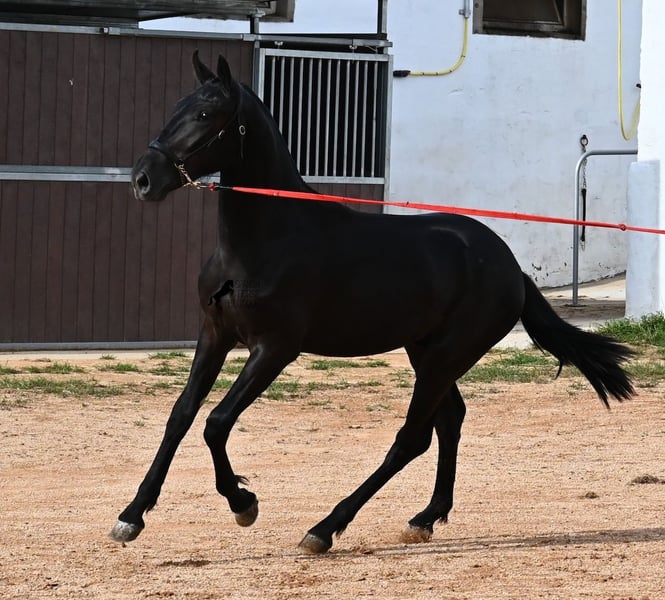 This purebred Menorquin stallion, born in spring 2024, is an absolute gem. As is typical for Menorquins, he is kept in a herd with 24-hour robust housing, and thanks to the rough climate and rocky terrain, he has good hoof quality, clean legs, and is as sure-footed as a mountain goat. ;) Noble blood flows through his veins, as his father has produced several breed champions, and on his mother's side, his grandfather is a Recomendado stallion, renowned for his excellent dressage performance. The young man is curious and is simply allowed to enjoy the horse life in the foal kindergarten. He knows how to be lunged in a halter and enjoys grooming, but is otherwise untrained. Later, he will be interesting both as a riding horse and as a driving horse, as Menorquins are very versatile! His expected final height is around 160 cm. Aside from some barely visible, isolated tick hairs on his head (which can hardly be called a star), he is completely black. If you wish to pick him up later, a breeding place can be organized for him. Videos and pedigree are available upon request. His location is Menorca. I would be happy to arrange a foal veterinary check, transport, or your trip if you wish to come and see him in person. Details can be found on my page or in conversation. Greetings from Spain!