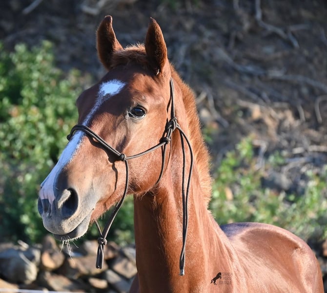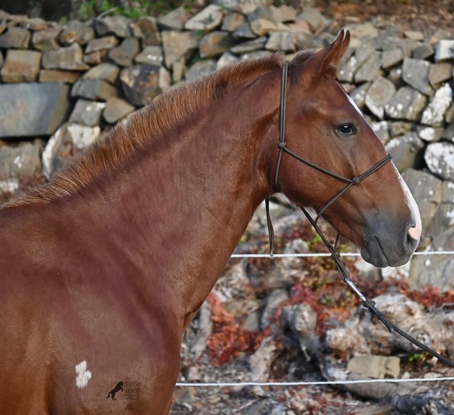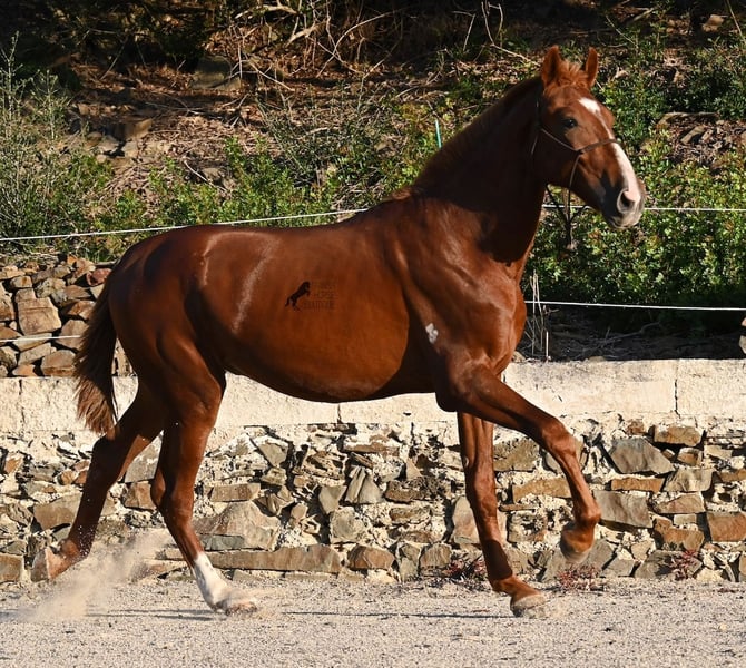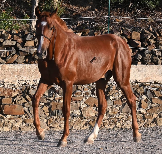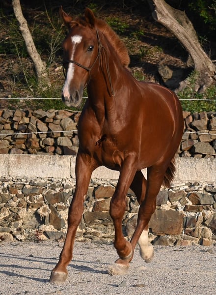A Menorquin is already a very exclusive horse, as they are endangered. It is very rare for Menorquins to be born in chestnut color, which are considered lucky charms. However, this 2024-born Menorquin stallion is even more extraordinary and unique, as he also has a blaze, one white sock, and a white mark on his right shoulder. So if you are looking for an unmistakable horse that is unmatched in uniqueness, then this chestnut jewel is the end of your search :) The young horse descends from old and original lines of the Menorquin, known for their resilience and endurance. He has the typical movements desired locally for the fiestas. Not very expansive but sofa-comfortable in all gaits! In handling, he is very well-behaved, though still a bit shy, as the horses from this breeder grow up in a robust environment on many hectares of land. He would surely appreciate a forever home where he can learn even more and have contact with people. Not long ago, the breeding association decided that the "red" Menorquins would also be recognized by the association, provided they are purebred. Thus, the young horse also has the original Menorquin papers and his entry in the studbook, but only black specimens are allowed for breeding. His expected final height is around 164 cm. Videos and pedigree available upon request! His location is Menorca. I would be happy to organize a foal inspection, transport, or your trip should you wish to come and see him in person. Details can be found on my page or in conversation. Greetings from Spain!