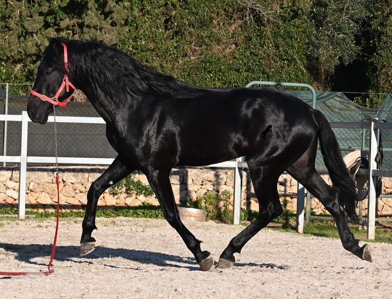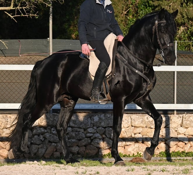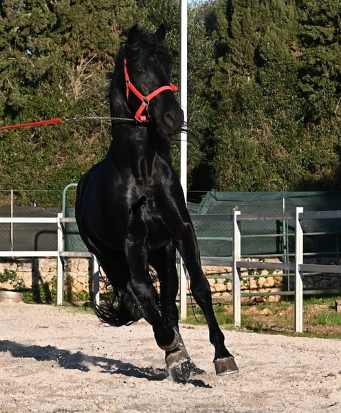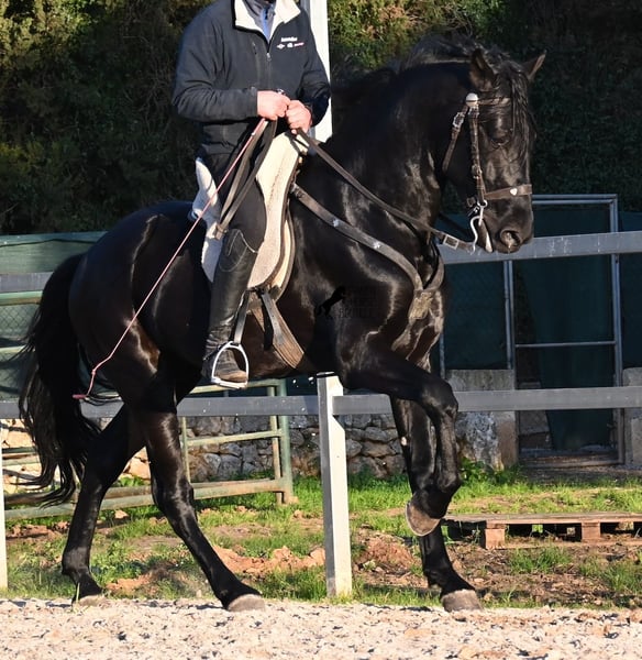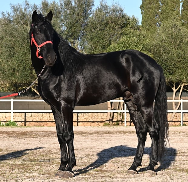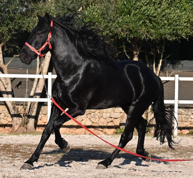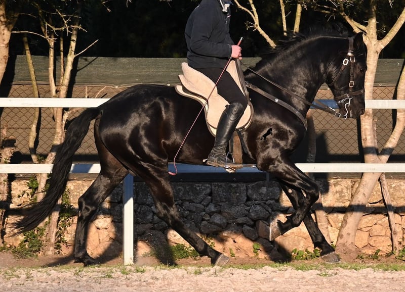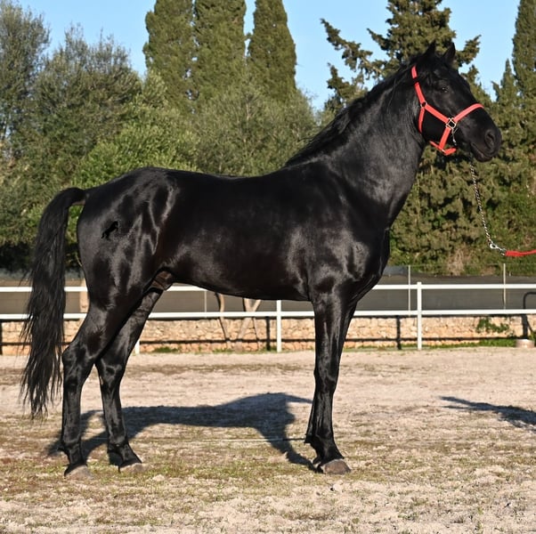 Dieser 2021 geborene, reinrassige Menorquinhengst, ist ohne Zweifel ein bildschöner Vertreter dieser edlen Rasse! Glänzend schwarz mit natürlicher Welle in der Mähne und nicht ein weißes Haar- Eleganz pur! Dazu hat er noch sehr gute Gänge, die ihn für die Dressur interessant machen, sollte man ihn auf englisch trainieren wollen, denn aktuell ist er in der menorquinischen Reitweise ausgebildet, die einhändig geritten wird. Die Umstellung wird ihm aber bestimmt nicht schwer fallen, denn er ist sehr intelligent und da er vor der Kutsche eingespannt wurde, kennt er die Zügelführung. Ein absolut feines Pferd unter dem Reiter, sehr arbeitssam und unglaublich wiff. Da er auch sehr biegsam und leichtfüßig ist, ist er auch in interessanter Kandidat für die Working Equitation. Seine Grundausbildung ist sehr solide mit lateralen Arbeiten und spanischen Schritt beherrscht er auch. Sowie den typischen Bot, das Steigen, wobei er es nur auf Abruf macht, weil er ganz klar die Kommandos respektiert. Er hat schon stattliche 169cm und wird noch an barockem Exterieur etwas zulegen, da die Menorquin Spätentwickler sind und noch nicht voll entwickelt bis 8 Jahre. Seine hervorragende Abstammung von einem sehr guten Vater klassischer Linien und einer prämierten Mutter mit Eliteblut, hat er schon weitergegeben und ein schönes Hengstfohlen hervorgebracht. An der Hand ist er erzogen aber etwas verspielt, denn er wird aktuell nicht so viel gearbeitet, aus Zeitmangel der Besitzer, was auch der Verkaufsgrund ist. Sobald er sich 5 Minuten die Beine vertreten hat, ist er tiefenentspannt und bleibt sogar frei am Reitplatz neben einem minutenlang stehen, wenn man sich unterhält. In fördernden Händen, hat dieses Pferd richtig viel Potenzial und auch für den Freizeitbereich ist er ein richtiger Schatz, wenn er etwas mehr Auslastung (oder Offenstall/Paddock) bekommt. Ausreiten geht er auch, meistens zu zweit oder in der Gruppe. Wenn Stuten dabei sind, tänzelt er kurz um zu zeigen, wie schön er wirklich ist, merkt aber gleich dass es verlorene Liebesmüh ist und geht in die Entspannung. Wer ihn als Hengst nicht halten kann, für den besteht selbstverständlich die Möglichkeit der Kastration vor Ort. Sein Standort ist Mallorca. Videos und Abstammung gerne auf Anfrage. Gerne organisiere ich vor Ort eine AKU, Beritt, Kastration, Transport oder auch ihre Reise, sollten Sie persönlich zum Anschauen kommen. Details dazu gerne auf meiner Seite oder im Gespräch. Saludos aus Spanien