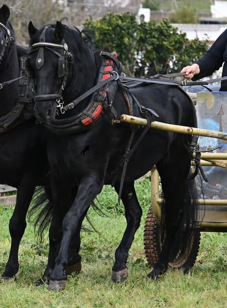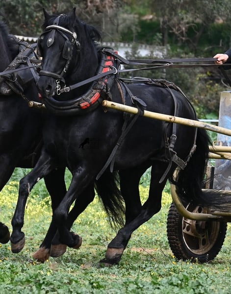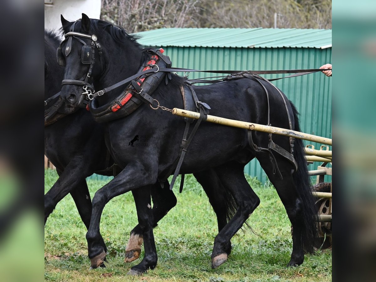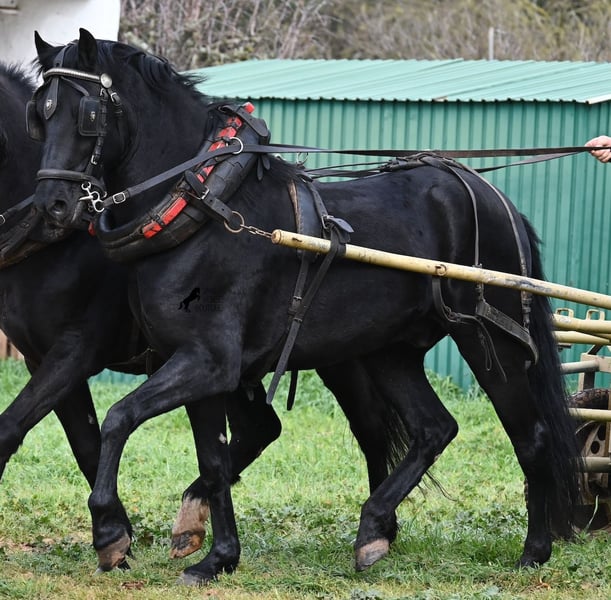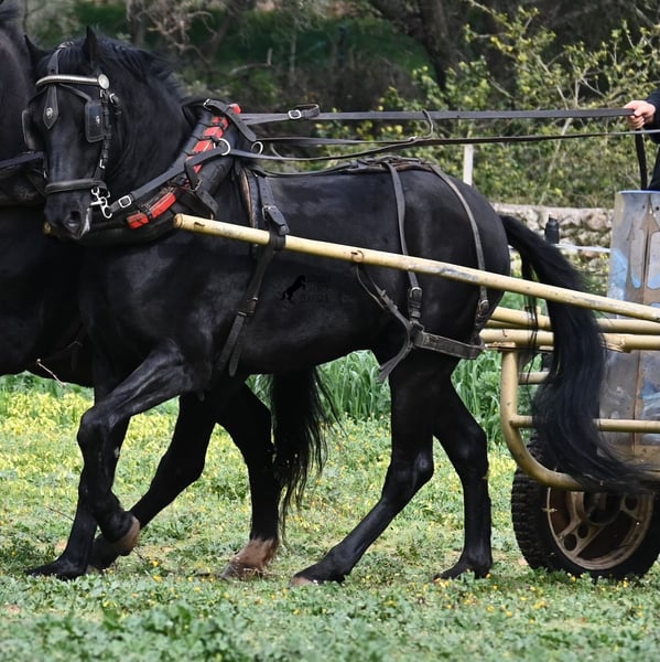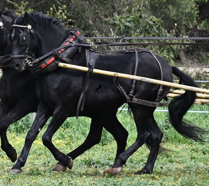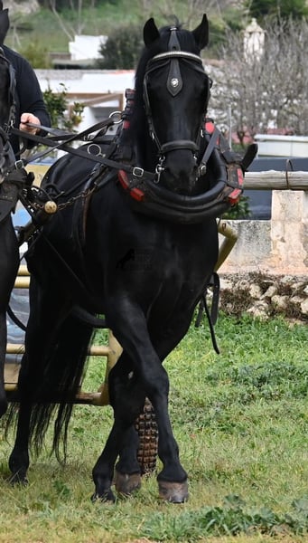 Questo stallone Menorquín, nato nel 2017, di razza pura, con un'altezza al garrese di 159 cm, si presenta compatto e armonioso. La sua struttura compatta si valorizza particolarmente davanti alla carrozza, dove viene condotto sia a traino singolo che multiplo. È nero lucente, senza segni bianchi, il che lo rende estremamente elegante come cavallo da tiro. Il suo movimento delle orecchie dimostra quanto sia attento e reattivo, rispondendo non solo alla guida delle redini, ma anche alla voce del conduttore. Sotto la sella, viene principalmente montato in passeggiata in campagna, quindi ha poca esperienza in arena con esercizi di dressage. Tuttavia, è un cavallo ideale per il tempo libero, perfetto per chi ama uscire o desidera continuare la sua formazione, poiché con la sua struttura potrebbe essere interessante anche per la Working Equitation. Nel rapporto con le persone, a volte mostra un pizzico di malizia, ma è assolutamente dolce e affettuoso. Si lascia condurre senza problemi anche senza ferrature, anche sui sentieri rocciosi di Menorca. Il prezzo riflette l’attuale categoria del Menorquín, una razza in via di estinzione e molto rara. La sua sede è a Minorca. Video e genealogia disponibili su richiesta. Su richiesta, posso organizzare una visita con certificato di salute (AKU), addestramento, trasporto o anche il vostro viaggio, nel caso vogliate venire di persona a vederlo. Per dettagli, consultate il mio sito o contattatemi direttamente. Saluti dalla Spagna