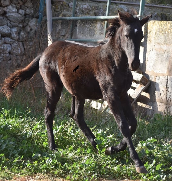 Born in the summer of 2024, this purebred Menorquin mare with full paper is a very cute young lady. She has a shining star and her dad is a multiple award winner for his awards in the local Doma Menorquina. Her paternal grandfather is one of the 3 elite stallions of the breed, with a lot of knee action, which has also come through in her. She is very compact and her expected final height is around 157cm. She is weaned together with her foal friend and is familiar with both the robust stall and the box. She is halter-trained and as her passport has already been issued, she is ready to move to her forever home. For today's steadily increasing price range of the Menorquin, she is also very affordable ;) If you want to get her later, a breeding place can be organized for her. Videos and pedigree on request. Her location is Menorca. I would be happy to organize a foal AKU on site, transport or even your trip, should you come to see her in person. Details can be found on my website or in conversation. Saludos from Spain