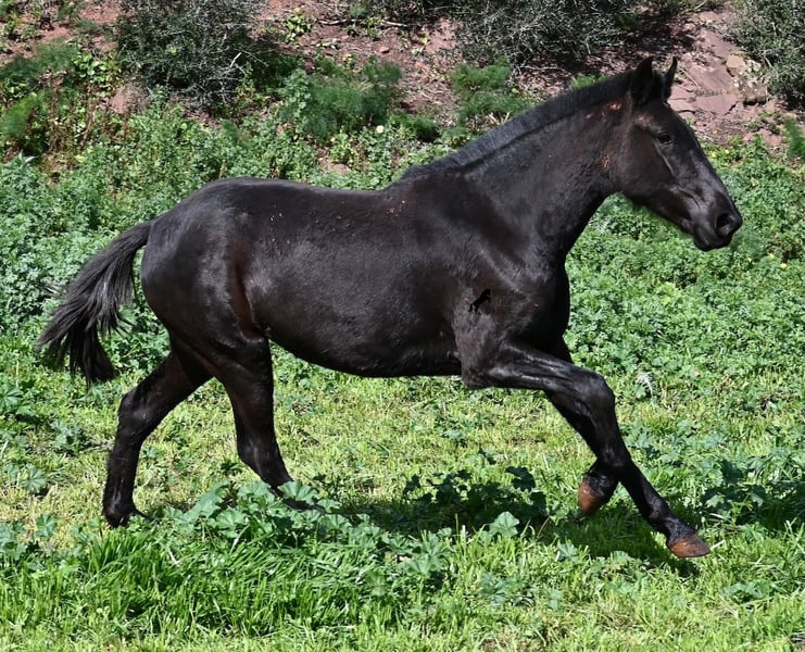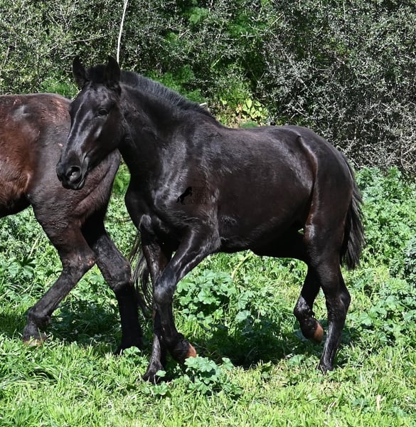 This 2023-born, purebred Menorquin mare is already very large for her age and will undoubtedly be a baroque beauty when fully grown! Her lineage is sensational, as she has both elite ancestry (there are only 3 elite stallions in the breed!) and a breed champion as a grandfather. The good breeding selection is evident in her already harmonious conformation and correct movement. She lives in a mare herd on many hectares of land, is well-socialized, and is also very robust due to the rustic upbringing. Whether it's slippery mud after the rain, like during the photo shoot, or rocky ground, she is absolutely sure-footed and moves skillfully over any terrain. Her expected height at the withers is around 163 cm, and she is interesting not only for riding sports but also for breeding! The price corresponds to her quality. Videos and pedigree available upon request. Her location is Menorca. I would be happy to organize a foal inspection, transport, or even your travel arrangements should you wish to come and see her in person. Details can be found on my page or in conversation. Greetings from Spain!