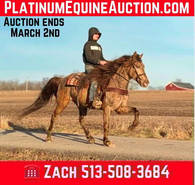 ONLINE AUCTION Place your bids at www.PlatinumEquineAuction.com Starting Bid $3500 Auction ends March 2nd, 2025 Need a new saddle? Check out White Rock Saddles on our website or Facebook! Dexter is a handsome champagne Kentucky mountain gouging that is 12 years old and stands exactly 15 hands tall. This is a been there done that horse that has been shown in trail ridden in several different states. This horse truly is a pleasure to work with and never causes any issues. He is always laid-back and peaceful, aiming to please. He is very clean and quiet in his stall and gets along well with other horses. On the trail, Dexter is confident and surefooted, and will ride at the speed you ask him to go slow or fast.. He has a nice relaxed walk, goes right into gait and can move on out when I asked without getting hot or pushy. He also has a very nice easy to sit lope. Dexter handles his self well in the rough terrain and is traffic safe as well. He has a beautiful long, flowing mane and tail to complement that beautiful champagne color. If you’re looking for something to catch every eye on the trail yet give you a safe ride. This is a horse you’ve been looking for. Located in Moscow, OH. Contact Brandenburg Stables Zach 513-508-3684 with any questions or to make a buy it now offer. Thanks! ONLINE AUCTION Place your bids at www.PlatinumEquineAuction.com Starting Bid $3500 Auction ends March 2nd, 2025 Need a new saddle? Check out White Rock Saddles on our website or Facebook!