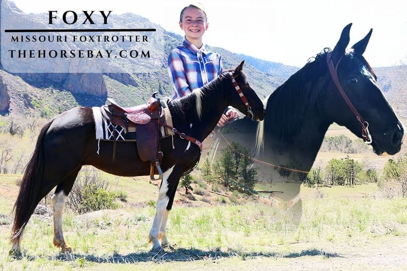 Meet Foxy, a beautiful 12-year-old Missouri Fox Trotter mare standing 15.2 hands tall. This striking black and white paint is as eye-catching as she is dependable. Foxy is the sweetest girl with a huge heart—she’ll do absolutely anything you ask. She is well-trained, incredibly gentle, and both husband- and kid-safe. She’s done it all—from pushing cows on the ranch to mounted shooting. Foxy is always our first pick to hit the trails—she’s the kind of horse you can swing a leg over without a second thought. This mare has no quit in her, and she’ll go all day with a great attitude. She’s also the most sure-footed horse we’ve ever ridden—confident and careful in any terrain, making her perfect for mountain rides, rough ground, or beginners learning the ropes.