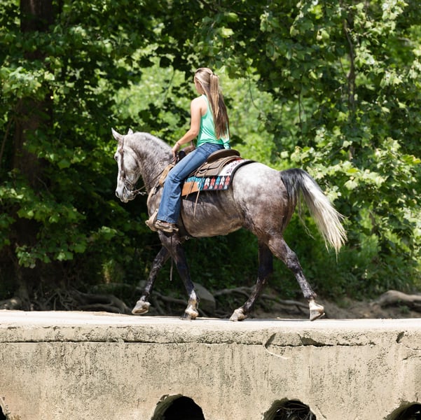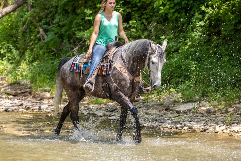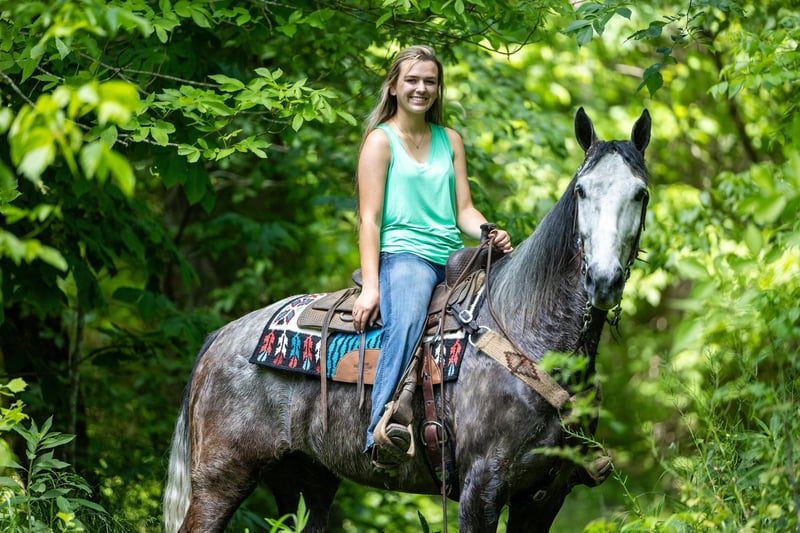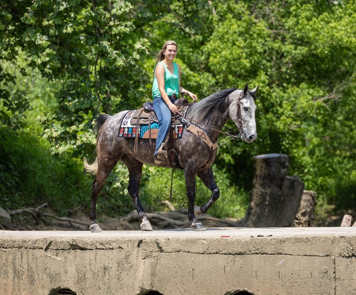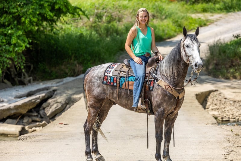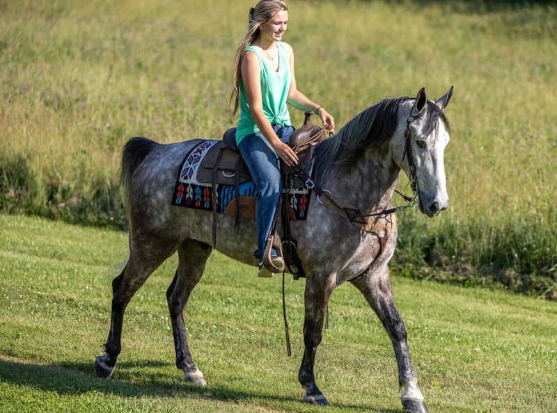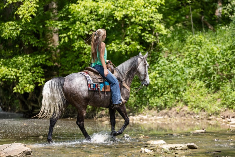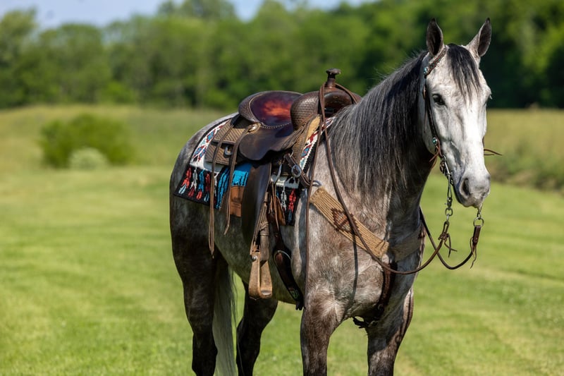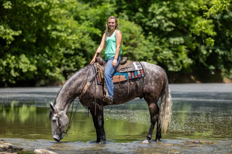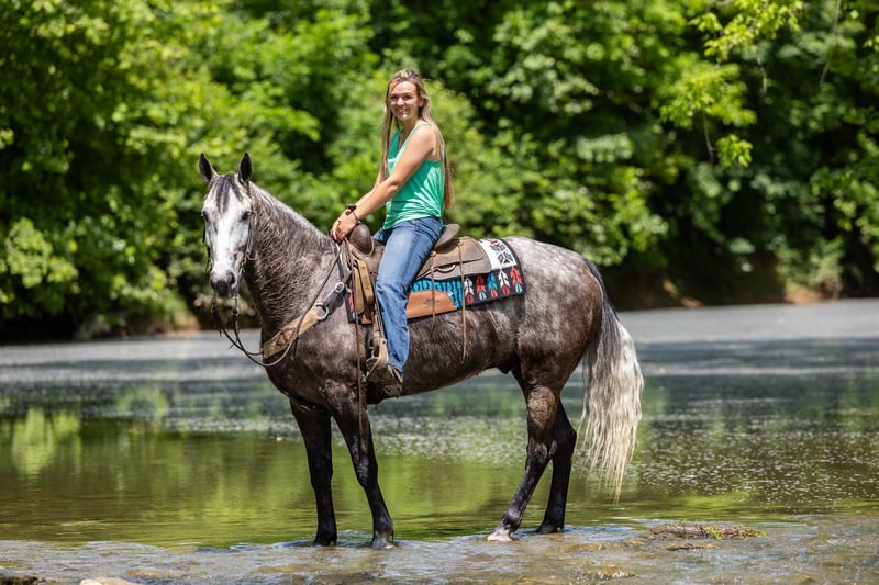 ONLINE AUCTION Place your bids at www.PlatinumEquineAuction.com Starting Bid $3500 Auction ends June 23rd, 2024 Need a new saddle? Check out White Rock Saddles on our website or Facebook! If you are looking for a trail horse on Saturday and then a horse to put on the rail Saturday night to win you some blue ribbons, look no further! Let me introduce you to Nelly. Nelly is a 6 year old DAPPLED GREY gelding. He stands 15.3 hands tall and will weigh 1100 lbs. Nelly has been used on the trails and in the show ring. He has a beautiful head set and will move out with a lot of action and style! Through the trails, Nelly will cross all obstacles with confidence rather that be trees, stumps, hills or water when asked. He is brave, sure footed and confident. He has been ridden in local fun shows and leaving with many blue ribbons! Nelly is a very personable horse! He will meet you at the gate every time! He is very gentle and doesn’t have a mean bone in his body! He stands to be saddled, bridled and groomed! He will park out on command with a tap on his shoulder! Stands for mounting and dismounting with or without a mounting block! If you’re wanting a lot of complements on the trail or a bunch of ribbons to hang on the wall, Nelly is your winner! For any other information please contact PR Quality Horses Colton 606-748-9009 or Haley 859-475-2621. ONLINE AUCTION Place your bids at www.PlatinumEquineAuction.com Starting Bid $3500 Auction ends June 23rd, 2024 Need a new saddle? Check out White Rock Saddles on our website or Facebook!