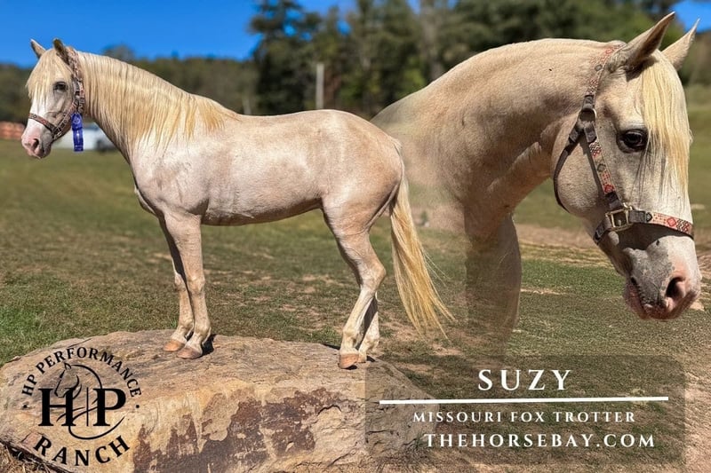 As golden as her color — Suzy is the total package! Smooth-gaited, confident, and kind-hearted, she’s the kind of mare everyone dreams of owning. Suzy is a 7-year-old palomino sabino Missouri Fox Trotter (grade) who checks every box — gorgeous, reliable, and a pleasure to ride. She’s as eye-catching as they come and even better to sit on, with a naturally smooth gait and a calm, easygoing personality. Out on the trails, Suzy is absolutely solid. She’ll ride out alone or happily with a group, and she’s not one to spook or hesitate. She crosses water, bridges, and logs with confidence, handles steep hills with balance, and rides safely along the road. She’s the type I trust to put my beginner friends on without a second thought — steady, patient, and dependable every time. Whether you’re out for a relaxing solo ride or leading a group, Suzy makes every mile enjoyable. On the ground, she’s easy to handle — loads, ties, bathes, and tacks quietly. She stands perfectly for the farrier and vet and has excellent manners in every situation. Suzy isn’t picky about trailers, either — if she’ll load into a two-horse straight load, she’ll load into anything. She’s been on several different friends’ trailers without a single hesitation. Suzy has been hauled to countless trail rides and local shows, and even camped overnight without a single issue. Just a few weeks ago, she entered her very first obstacle challenge — her first time ever seeing obstacles — and impressed everyone by taking home 1st place, competing against seasoned horses with far more experience. Suzy sells with a current Coggins, fresh vet check, and is UTD on vaccines (5-way & rabies), teeth, and farrier work. PPEs are welcome at the buyer’s expense, and test rides or FaceTime calls are available upon request. If you’re looking for a stunning, smooth-gaited mare with the heart and brain to match, Suzy is your girl. She’s the kind of horse that makes every ride, and every day, better.