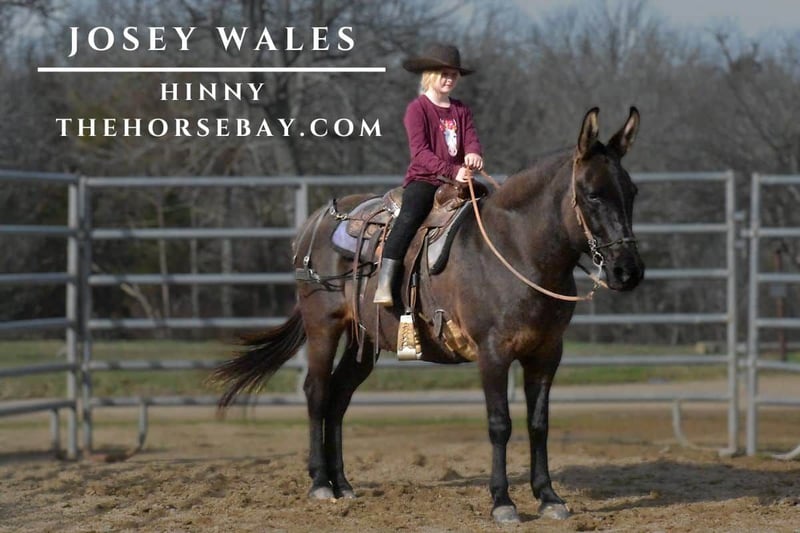 OPEN BIDDING ON THEHORSEBAY,COM. SALE ENDS ON 01/22. More information is available on the website, including an UTD vet inspection, Coggins, video, images, and the owner's contact information to ask questions, request information, or make arrangements to come to visit. Meet Josey Wales; he is a 14.2-hand, 10-year-old Grulla Hinny. A hinny is a cross of a horse stallion and a jenny donkey. Josey is out of a quarter-horse stud, as shown in his confirmation. This guy is stout, safe, and pretty. He has a deep chest and a big broad butt; his striking grulla color is eye-catching, and you will stand out everywhere you go. He will be the leader on the trails with confidence or he will follow in the back of the group calmly and quietly. He is already a slow and safe hinny, but Josey slows down when a kid rides him and becomes a sure enough babysitter. Josey has ridden many miles here in southeast Oklahoma. He is comfortable and confident riding in rocky terrain, big water crossings, encounters with wild animals, big groups of trail riders, and even parades. He is also comfortable with a crupper or a breeching, good with his ears, and safe with his feet. He is easy to catch and groom, including clippers, saddle, and tailer. He is great around dogs and will make a good hunting hinny, whether you are hunting squirrels, hogs, coons, or whatever you’re after. Josey is even safe to ride at night. He has been coon hunting numerous times in his life. He is an easy keeper. Not just his condition, he does not need regular riding to stay warm, gentle, and safe. He is solid and sound and has never had any health issues. He is respectful around the barn and gets along well in the herd. Don raised this hinny, but he is getting to the age that he wants to downsize his herd, and that is why someone is getting the opportunity to own this awesome hinny. Josey Wales is a pure pleasure to be around and will make someone a lifelong companion.