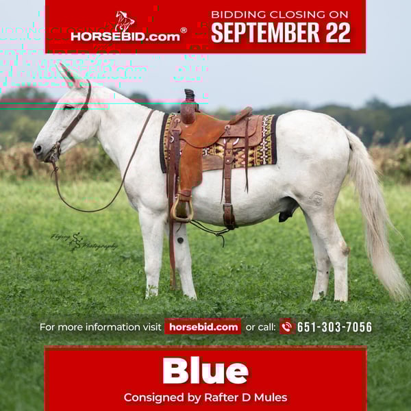 🍁𝒕𝒉𝒆 𝐅𝐀𝐋𝐋 𝑺𝒑𝒆𝒄𝒕𝒂𝒄𝒖𝒍𝒂𝒓🍁 Happening now thru MONDAY | SEPTEMBER 22nd - Available EXCLUSIVELY on HorseBid's website! For more details and to register visit: www.Horsebid.com CONSIGNOR CONTACT: Rafter D Mules 651-303-7056 LOCATION: Hastings, MN BREED: Mule REGISTERED: No COLOR: Gray HEIGHT: 15 AGE: 12 GENDER: John Mule Blue is a handy mule who we are proud to offer. He has been in our personal string for several years! Blue has a been there, done that type of ride. He will be the same way every time you get on him, no matter how much time he has off. Blue is suitable for any age rider with any level of experience. You can trust him to be honest with everyone you put on his back. Blue is accustomed to working in the arena and on the ranch, never shying from a hard day's work. He has been ridden across rugged mountain terrain, on trails, across downed timber, through large creeks, and through every ditch or steep embankment that you can find. Blue is easy to bridle, groom, clip, and tack up. Blue is not ear shy and is a gentleman when having his feet handled. He will stand to be mounted from a mounting block or the ground. If you're in search of a mule that the entire family can enjoy but is still handy enough to go out and do a job, you have found him! If you have any questions about Blue or would like to meet him prior to the auction ending, please contact Dillon at Rafter D Mules 651-303-7056.