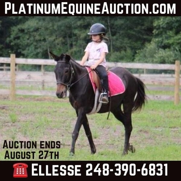 ONLINE AUCTION Place your bids at www.PlatinumEquineAuction.com Starting Bid $3500 Auction ends August 25th, 2024 Need a new saddle? Check out White Rock Saddles on our website or Facebook! Proudly offering Moscow Mule for sale. Here’s a John mule everybody can ride, handle on the ground, and love! Moscow is 13 years old and 13.1hh. He’s at that perfect middle age and just the right height for both kids and adults to enjoy! Moscow rides both English and Western. This boy has excellent brakes and rides around in a snaffle, curb, or halter and lead rope. He has been started over fences and jumps around a hunter course willingly. This summer Moscow was used in our summer horse camp. Kids from 4-year-old newbies to experienced young teens were riding him! Moscow has been on countless of trail rides, climbed the steep Rocky Mountains, and has swam through the Kensington kayak river. He has even been ridden thru our local drive-thru for ice cream! He’s a point-and-shoot type of guy. He’s a very trustworthy and willing partner! There is not one bad thing I could say about this wonderful mule! Mules like Moscow are rare and hard to find! Enjoy the video, you will see Moscow in a variety of environments with a wide array of riders. Located in Howell MI 48855. Call or text Ellesse Schwartz 248-390-6831 for more info. ONLINE AUCTION Place your bids at www.PlatinumEquineAuction.com Starting Bid $3500 Auction ends August 25th, 2024 Need a new saddle? Check out White Rock Saddles on our website or Facebook!