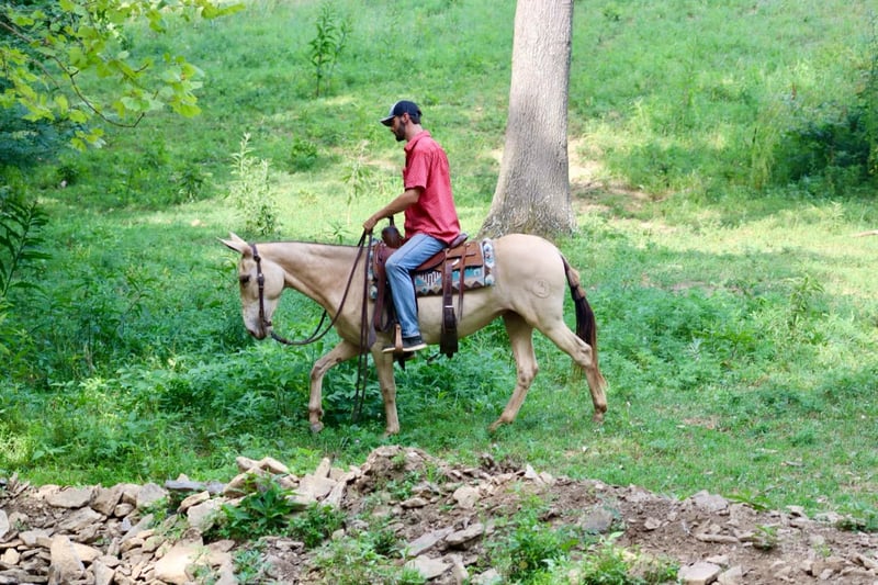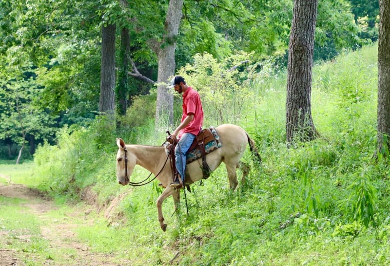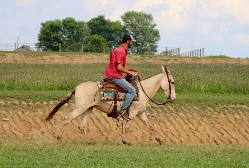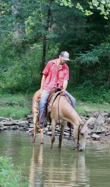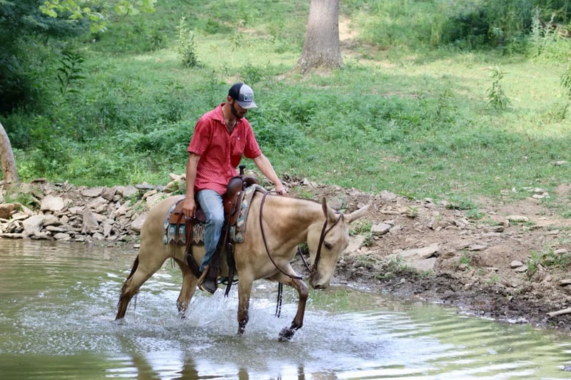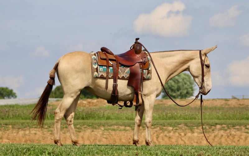 ONLINE AUCTION Place your bids at www.PlatinumEquineAuction.com Starting Bid $3500 Auction ends July 28th, 2024 Need a new saddle? Check out White Rock Saddles on our website or Facebook! My María is a stunning 6 year old, 14.2 hand ranch mule. Her eye catching champagne color and fun personality, makes her a joy to get on and ride everyday whether you are going on a relaxing trail ride, heading out for ranch work, or off to enjoy a fun show. María has been used in all aspects of ranch work. From roping and doctoring cattle, sorting pairs, to checking fence. She is comfortable around cattle and isn’t afraid of a hard day of work. She has spent a lot of time in west Texas and New Mexico, so seeing big country and some rough terrain is nothing new to her. If you’re looking to head out on a nice trail ride, she is game for that too. She will ride anywhere in the group, and will quietly ride away from her friends if asked. She also rides out alone confidently. María enjoys more difficult trails too. Point her nose up a steep bank and she will go, ask her to slide back down, she does it with ease. She walks over logs, goes through brush etc. She crosses water and doesn’t mind if it gets deep. María has also done extreme type trail obstacle such as swinging bridges, going up and down stacks of tires etc. María has a nice walk, jog, and lope. She neck reins, backs, and has a nice turn around. She rides nicely collected and has a beautiful lope on a full drape across the pasture field. You can open and close gates on her. She stands tied well and is quiet to tack up. She stands to mount and rides off nicely. María has been going to local fun shows this summer and handles that commotion nicely as well. She is traffic safe and has been ridden around farm equipment that is working. María is a super nice, all around mule that is super fun to ride. Don’t miss out on a great one! For more information, contact Sammi Waugh 704-798-5497 Located in Brooksville, KY. ONLINE AUCTION Place your bids at www.PlatinumEquineAuction.com Starting Bid $3500 Auction ends July 28th, 2024 Need a new saddle? Check out White Rock Saddles on our website or Facebook!