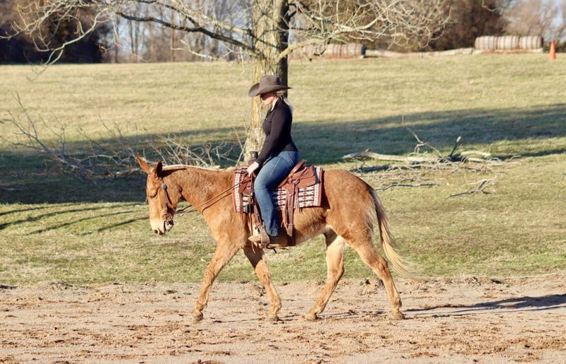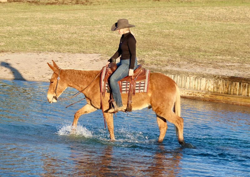 ONLINE AUCTION Place your bids at www.PlatinumEquineAuction.com Starting Bid $3500 Auction ends April 6th, 2025 Need a new saddle? Check out White Rock Saddles on our website or Facebook! Cisco is a 7 year old 14.3 hand palomino John mule. He is a well made and shapey mule and quite the looker! Cisco has lots of miles on the trails. From New England through the Midwest he has been around. Cisco takes in new places well and doesn’t get stressed traveling. He rides anywhere in the group. He will lead or follow. If you need to him to away from the group or wait behind, he will do it without a fuss. Cisco enjoys obstacles. He steps over logs, crosses water, goes up and down banks, steps through ditches. He has also done some arena obstacles too and really enjoys that! Cisco will walk, jog, and lope. He backs and has been learning to sidepass and starting to turn on the haunches and forehand. Cisco rides softly in the bridle and could easily be finished out and do some showing. He has a nice, easy jog or will trot out. He carries his head and neck well and riding outside goes on a loose rein. Cisco has ridden out with green mules and offers confidence to them and will lead them over obstacles and terrain they aren’t sure of yet. Cisco trailers well. He stands tied nicely whether it’s at the trailer or barn. He’s been hobbled. He’s been out on the overnight high line. He stands good to groom and tack up. Cisco is a super nice mule. He is friendly and enjoyable to be around. Just an overall good guy! For more information, please call/text Sammi Waugh 704-798-5497 Located in Brooksville, KY. ONLINE AUCTION Place your bids at www.PlatinumEquineAuction.com Starting Bid $3500 Auction ends April 6th, 2025 Need a new saddle? Check out White Rock Saddles on our website or Facebook!