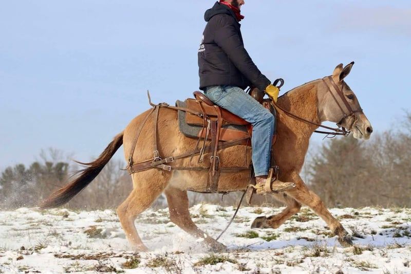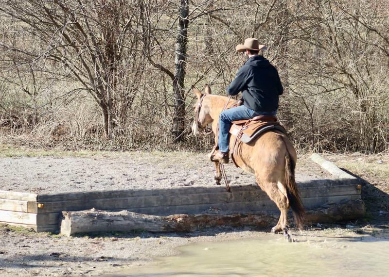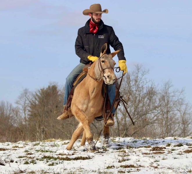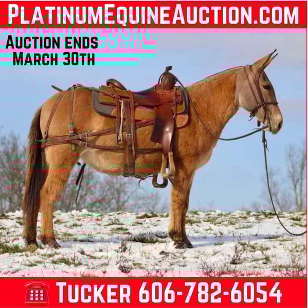 ONLINE AUCTION Place your bids at www.PlatinumEquineAuction.com Starting Bid $3500 Auction ends March 30th, 2025 Need a new saddle? Check out White Rock Saddles on our website or Facebook! Nina is a 9 year old, 13.2 hand Molly mule. Don’t let her height fool you, Nina is just about as wide as she is tall! The rider in the pictures is 6’4”. Even though she is stocky, Nina is still quite athletic. She is an excellent trail riding mule. She has had lots of miles on the trails in various terrains. She walks, jogs, and lopes. Has a decent handle on her and rides one handed. Nina jumps up and down banks, she steps over logs, and crosses water without hesitation. Nina gets along with other mules in the pasture. She hauls well. She’s been tied out on the high line on overnight camping trips with no issues. The previous owners worked her single and double, but we have not personally hooked her. Nina is a good looking mule that is ready to go on the big rides! Lots of heart to go all day. For more information, please call/text Brookside Horse Sales Tucker 606-782-6054 Located in Brooksville, KY. ONLINE AUCTION Place your bids at www.PlatinumEquineAuction.com Starting Bid $3500 Auction ends March 30th, 2025 Need a new saddle? Check out White Rock Saddles on our website or Facebook!