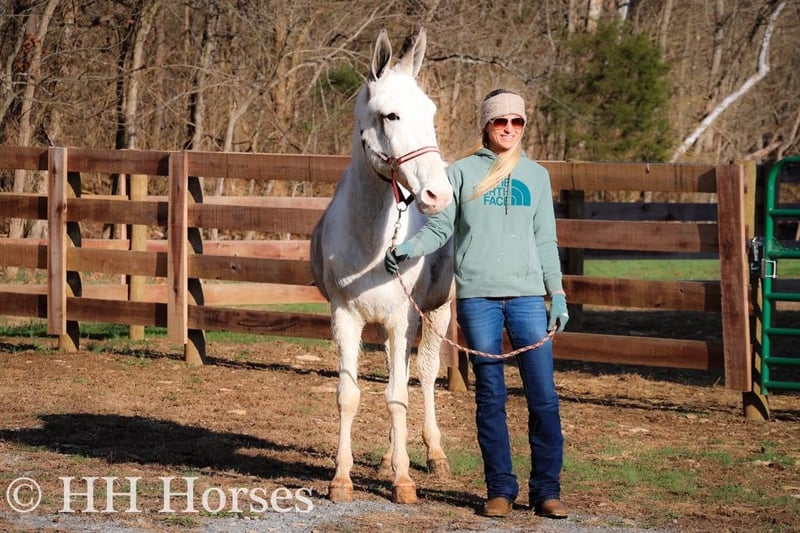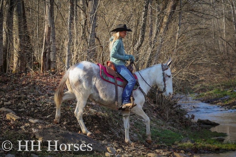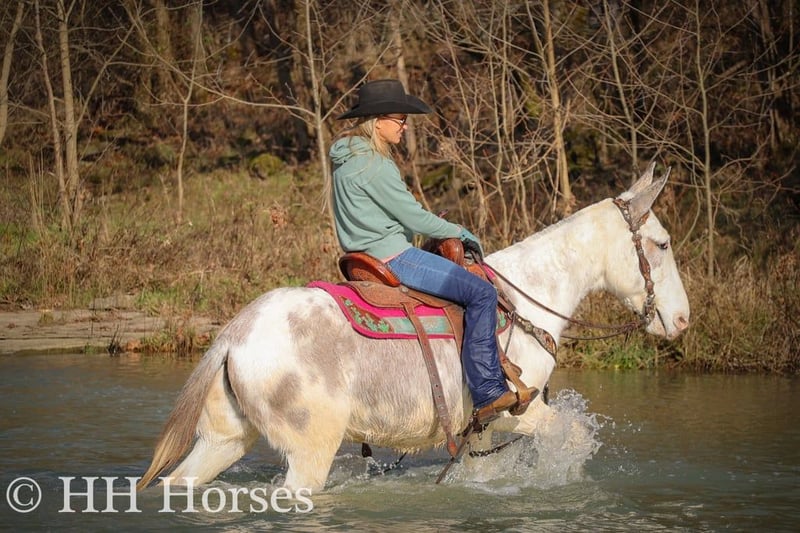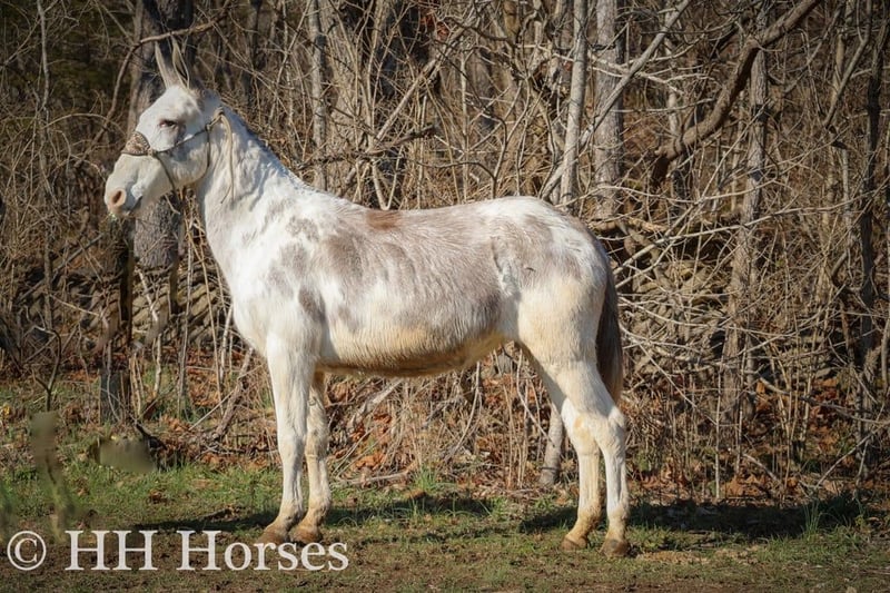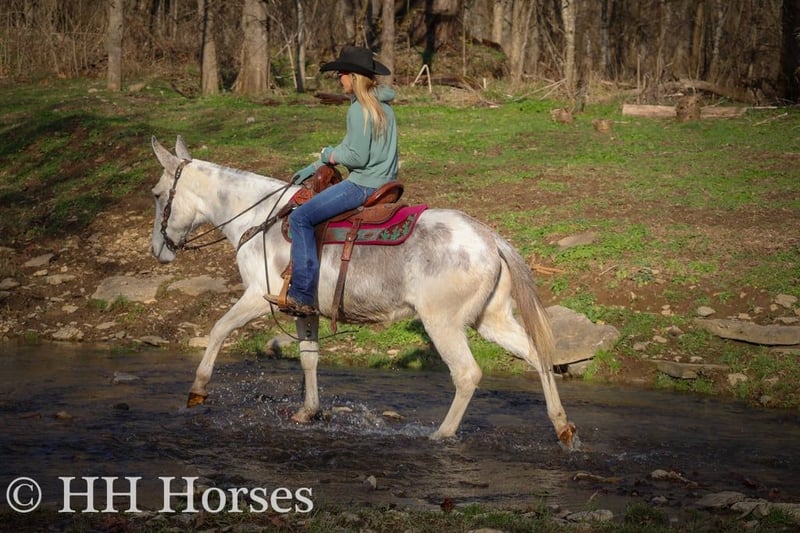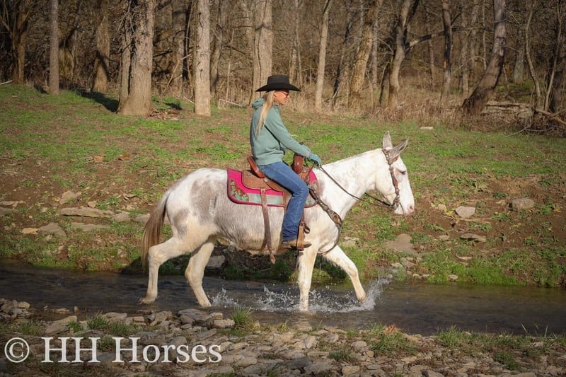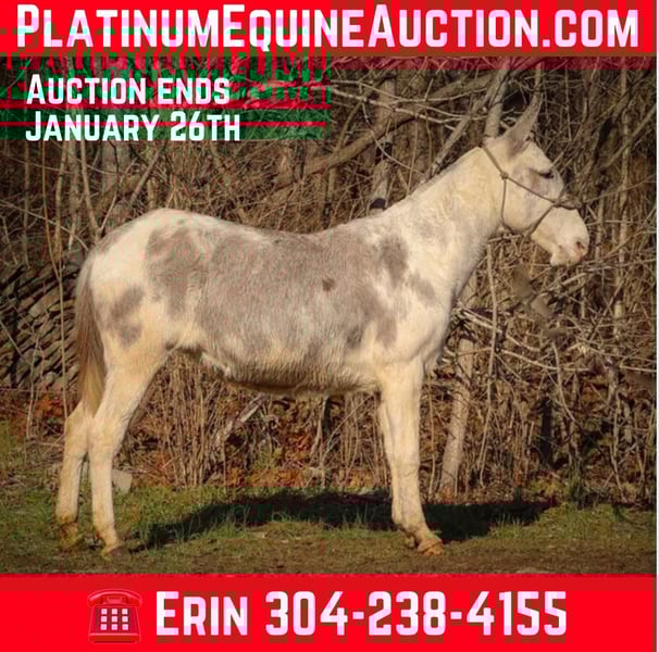ONLINE AUCTION Place your bids at www.PlatinumEquineAuction.com Starting Bid $3500 Auction ends January 26th, 2025 Need a new saddle? Check out White Rock Saddles on our website or Facebook! This is “STARDUST”, a FLASHY, FUN, GENTLE, AND QUIET NATURED Blue Roan Paint Molly Mule that has been ridden by novice and beginner riders. This mule has been in the mountains and ridden by a gentleman in his 70’s. She has no buck, no hump, and no tricks or surprises. She is an easy mule to have around that handles her ears, all four feet, and she has excellent ground manners. She stands tied quietly, loads, bathes, and hauls with no issues. She stands 14.2 hands tall and is 11 years old. She has been through deep water, on rough and rocky ground, and on the main roads. She has been on organized rides with lots of other horses, mules, wagons, and commotion and handled it all fine. She also rides out alone with confidence and enjoys to trail ride. She will not go any faster than what you ask of her, she is easy to stop, and she stands to mount. She has been ridden double, bareback, and also in just a halter and lead rope. If you need a quiet gentle mule that is a handy size to get on and off of, don’t miss out. She’s pure and honest. For more info or to make a Buy It Now Offer call HH Horses Erin 304-238-4155 Located in Flemingsburg, KY. ONLINE AUCTION Place your bids at www.PlatinumEquineAuction.com Starting Bid $3500 Auction ends January 26th, 2025 Need a new saddle? Check out White Rock Saddles on our website or Facebook!