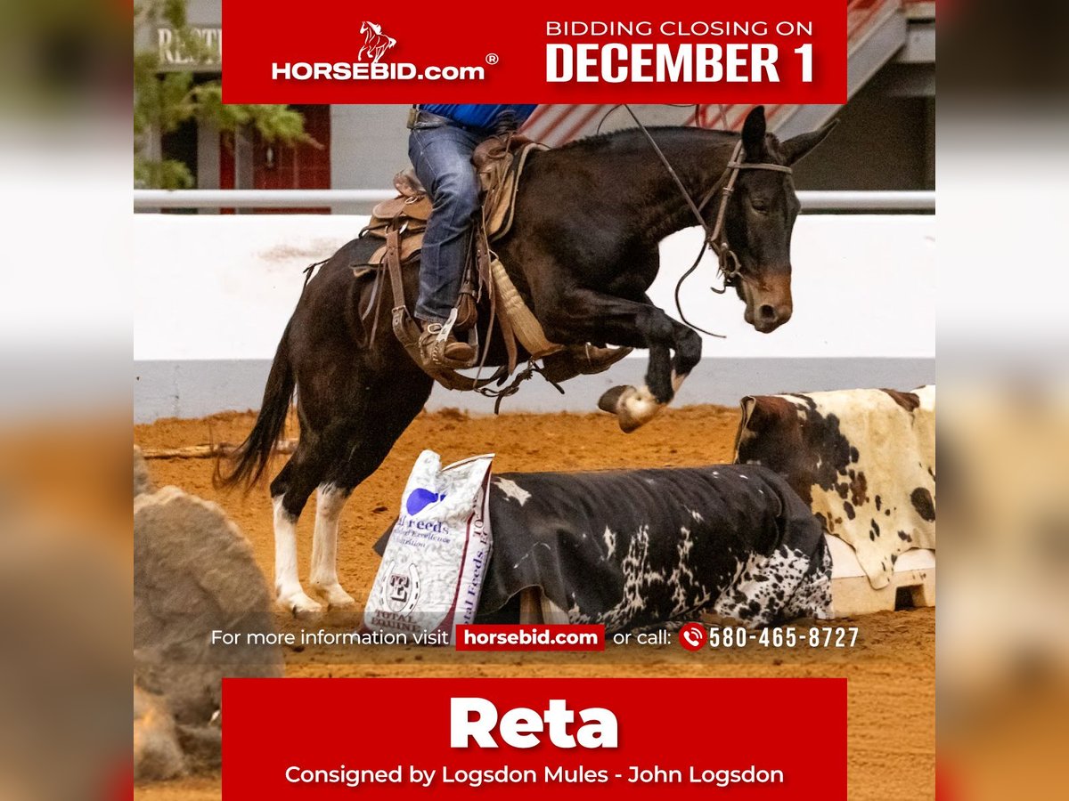 ⚜️ 𝓽𝓱𝓮 𝐇𝐨𝐫𝐬𝐞𝐦𝐚𝐧'𝐬 𝓢𝓱𝓸𝔀𝓬𝓪𝓼𝓮⚜️ Happening now thru MONDAY | DECEMBER 1st - Available EXCLUSIVELY on HorseBid's website! For more details and to register visit: www.Horsebid.com CONSIGNOR CONTACT: Logsdon Mules - John Logsdon 580-465-8727 LOCATION: Fittstown, OK BREED: Mule REGISTERED: No COLOR: Black with 4 white legs HEIGHT: 14.3 AGE: 4 GENDER: Molly Mule Meet Reta, a stunning 4-year-old Molly mule with a proven track record and a heart of gold. With extensive trail riding experience in Oklahoma and Colorado, Reta has developed into a reliable and athletic companion. This beautiful young mule stands 14.3 hands tall and boasts impressive credentials: - *Trail Ridden*: Comfortable and sure-footed on varied terrain in OK and CO - *Ponied Colts*: Stays quiet under pressure - *EXCA Reserve Champion*: Open Mule Division - showcasing her talent and willingness Reta’s disposition, looks and ability are sure to turn heads wherever she goes. Whether you're looking for a trail partner, a ranch mule that can be shown, or just a trusted companion, Reta fits the bill. If you're seeking a young, talented, and versatile mule with a bright future, look no further. Contact us to learn more about Reta and arrange to come and meet her!