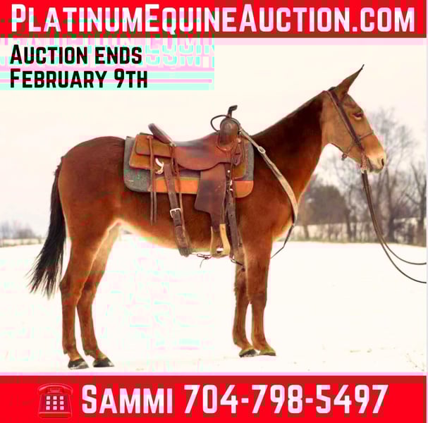ONLINE AUCTION Place your bids at www.PlatinumEquineAuction.com Starting Bid $3500 Auction ends February 9th, 2025 Need a new saddle? Check out White Rock Saddles on our website or Facebook! Rose is an 8 year old, 14 hand gaited Molly mule. Rose has a very nice ground covering, ear flopping walk when she gets in gear and headed down the road or trail. Rose is experienced on the trails. She crosses natural obstacles with ease. Goes through and across water crossings without worry. She is sure footed on narrow and technical trails. She steps over logs and goes through ditches. Rose rides out alone or with a group. She can keep up with other gaited animals or ride slower with quarter type. She is a mountain goat type, if you point her nose, you better be ready to go! She is a forward mule with a lot of heart to ride all day. Rose stands nicely to saddle. She ties and clips. Has nice stall manners. Loads and unloads easily. Rose rides off nicely if she has had time off, but like anyone excels when ridden in a regular riding program. She has been on quite a few big, organized rides. We have ridden her through our herd of cows and checking fences with no issues. Rose is the type of mule that you need to earn her trust and respect. It’s easy to get, but experienced mule owners understand her type. She will do best in a home with 1 or 2 riders, not so much for a guest or “dude” type of mule. With that being said, she will give her person 110% every ride and only gets better the more she knows and understands her person. For more information, please call or text Sammi Waugh 704-798-5497 Located in Brooksville, KY. ONLINE AUCTION Place your bids at www.PlatinumEquineAuction.com Starting Bid $3500 Auction ends February 9th, 2025 Need a new saddle? Check out White Rock Saddles on our website or Facebook!