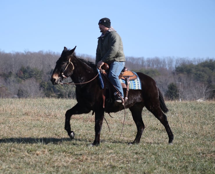 ONLINE AUCTION Place your bids at www.PlatinumEquineAuction.com Starting Bid $3500 Auction ends January 4th, 2025 Need a new saddle? Check out White Rock Saddles on our website or Facebook Jonah is a beautiful black John (gelding), he is a 10 yrs old and he stands a stocky built, 15 hands tall! This is one mule that is 100% no fuss-easy to ride! Whether you ride him every day or leave him off for a couple months, he rides gentle. My 7 year old nephew has ridden him around the farm and though the trails. Jonah is very laid back, rides on a loose rein and is never in a hurry. Jonah is not spooky and has miles and miles of experience from the mountains to the valleys he will cross anything that he is asked to from rivers to creeks, scale steep slopes while being sure footed and picks his path is a tight situation. He can handle the rough rocky trails, steep inclines and deep water… nothing bothers him and he feels right at home on the trails! He has been ridden around cattle. Jonah has been hauled on week long and weekend trail rides. He has been ridden by all members of our family. He loads right up with no issues. Jonah has a smooth lope although his favorite thing to do is walk on a loose rein and enjoy the scenery. He picks up his leads and rides in the arena as well as outside. Dogs do not bother him and is traffic safe! Jonah has no issues with his ears. Call Trevor Patrick 606-516-8069 with any questions. Located in Brodhead, KY. ONLINE AUCTION Place your bids at www.PlatinumEquineAuction.com Starting Bid $3500 Auction ends January 4th, 2025 Need a new saddle? Check out White Rock Saddles on our website or Facebook