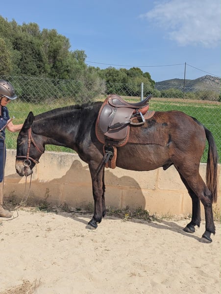 Nacho llegó hace aproximadamente un año con algunas "pequeñas molestias" y desde entonces ha progresado mucho. Ahora deseo para él un nuevo hogar donde pueda seguir siendo desarrollado y desplegar todo su gran potencial. Me lo vendieron como un caballo para montar y para caravana. En el suelo y en la cuerda doble se muestra tranquilo, atento y trabaja con motivación. También bajo la silla en la pista de doma realiza un buen trabajo. Nacho es muy inteligente y sensible, por lo que se beneficia especialmente de una persona experimentada y empática. Lamentablemente, ha desarrollado un eccema que desaparece completamente en los meses de invierno. Con el manejo adecuado, esto se puede controlar bien. Nacho es muy sociable y se siente más cómodo en compañía de otros caballos. Un hogar con una manada grande, donde pueda moverse según su edad y también desahogarse, sería ideal para él. Físicamente está en buena forma y saludable. Sus dientes y análisis de sangre fueron revisados en febrero, y sus cascos se mantienen en buen estado con revisiones cada seis semanas. Por supuesto, está vacunado y recibe desparasitaciones rutinarias. Para más información y videos, por favor, contacta por mensaje privado. La ubicación es Mallorca.