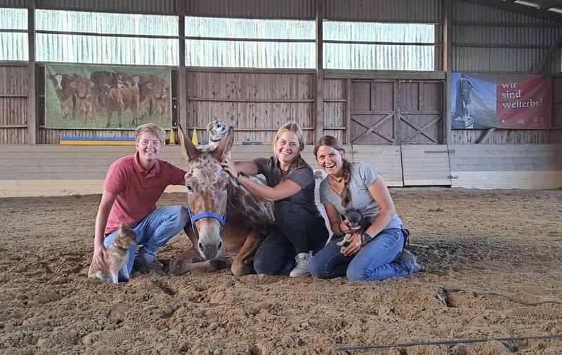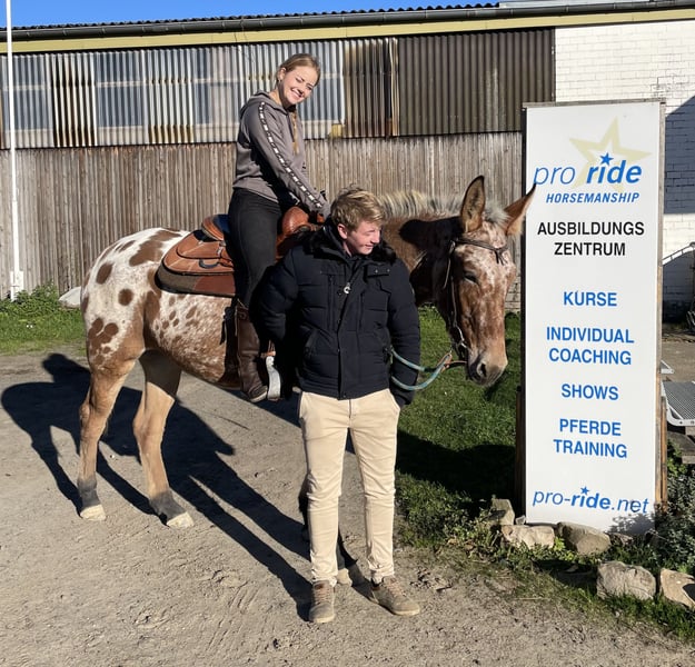 Chili – einzigartiges Muli sucht liebevolle und fördernde Hände Chili ist ein ca. 1,55 m großes Muli mit einer außergewöhnlichen Appaloosa-Optik und damit ein echtes Unikat. Sie lebt bei uns, seit sie ein Jährling ist, und zeigt sich im täglichen Umgang als sehr menschenbezogen und verschmust. Bei uns wurde Chili vor allem in der Freiarbeit gefördert und ist darin weit ausgebildet. Sie zeigt Freude an der freien Arbeit, lässt sich frei zirkeln, kommt zuverlässig auf Ruf und legt sich bei uns auf Kommando ab. Zudem wurde sie geritten. Im Jahr 2022 war Chili für etwa vier Monate bei Pro Ride Horsemanship zur weiteren Ausbildung. Seitdem wurde sie aus zeitlichen Gründen bei uns nicht mehr regelmäßig gearbeitet. Aus diesem Grund wünschen wir uns für sie ein neues Zuhause bei motivierten Menschen, die Freude daran haben, mit ihr zu arbeiten, ihr vorhandenes Können weiter zu fördern und sie entsprechend zu beschäftigen. Ihr findet uns in 49779 Oberlangen, die genaue Adresse schicke ich euch gerne nach einem persönlichen Gespräch zu. Ihr könnt mich unter der Handynummer 01624348386 erreichen. Bitte nur telefonisch
