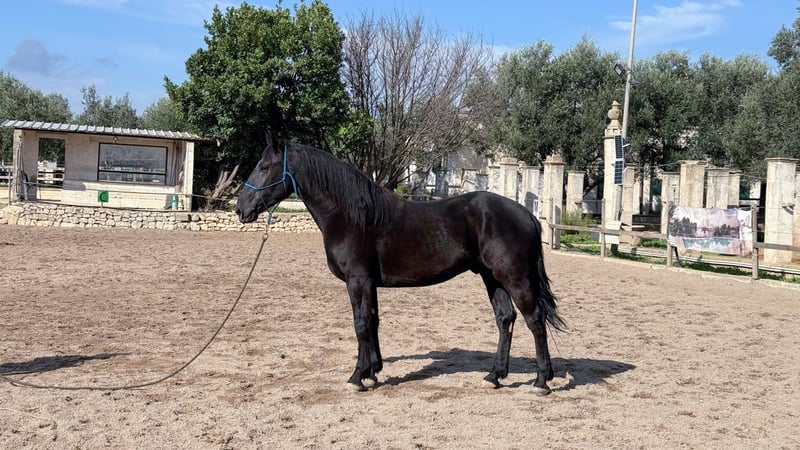 ~ Sinatra ~ is one of those horses whose development we have been monitoring for several months and that consistently catches our eye. Sinatra belongs to the lighter yet still visually baroque type of Murgesen. We estimate his final height at approximately 16.1 hh. The young colt has a solid foundation, with a beautiful topline and a pleasant, well-set neck. Overall, he is a typy representative of his breed. He also has a very sweet temperament—open and friendly, curious, and non-intrusive. He approaches people with confidence and interest. This young stallion was born and raised in this breeding program. He was kept outdoors according to breed standards until he was two years old, when he moved into stables and was socialized with humans. Sinatra knows all the basics expected at his age. Currently, he is learning additional fundamentals, including saddle work. He is always eager to learn and shows himself from his best side. Would you like to meet Sinatra in person? He is currently still in his homeland in Apulia—we are happy to arrange a visit with you. X-rays are available, and upon request, he can be castrated directly at the breeder’s, along with a clinical health check (AKU). We will also organize everything else for you—castration (included in the price), handling of the purchase contract, transport to your home stable, and more. We look forward to hearing from you! More photos and a video of him in motion are available upon request. — on behalf of the Italian Murgesen Association A.N.A.M.F.