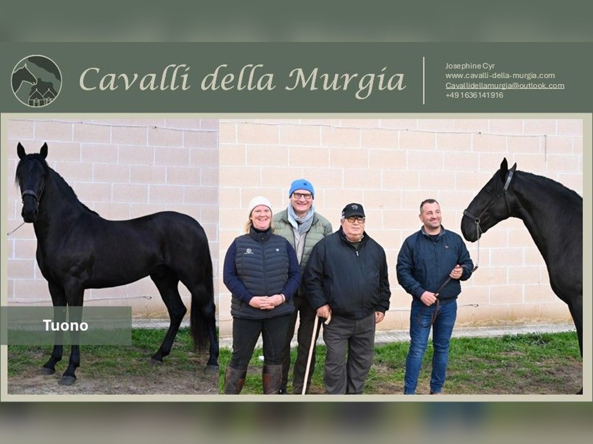 Tuono ist ein eher ruhiger und seriöser Junghengst, der bereits bei der Junghengstkörung seine Qualität unter Beweis gestellt hat. Unter rund 120 Konkurrenten belegte er in der Kategorie der 30 Monate alten Junghengste den zweiten Platz. Mit einem Stockmaß von 161 cm und einem Preis von etwa 10.000€ präsentiert sich Tuono als vielversprechender Partner für die Zukunft – sei es in der Zucht oder im Freizeitbereich. Vollgeschwister können ebenfalls besichtigt werden, was einen zusätzlichen Einblick in die Qualität und Charakter der Linie ermöglicht. Tuono befindet sich aktuell beim Züchter in Apulien, Italien. Tuono hat Ihr Interesse geweckt und Sie möchten ihn gerne persönlich kennenlernen? Aktuell steht Tuono noch in seiner Heimat, Apulien bei seinem Züchter. Wir helfen Ihnen sehr gerne, einen Besuch dort zu planen. Tuono wird durch Cavalli della Murgia vermittelt. Röntgenbilder sowie weitere Bilder und Videos stellen wir gerne auf Anfrage zur Verfügung. Die komplette Kaufabwicklung inklusive AKU und Transport nach Deutschland wird ebenfalls von uns organsiert. Haben Sie noch Fragen? Schreiben Sie uns gerne ein Mail - cavallidellamurgia@outlook.com. Wir freuen uns auf Ihre Nachricht.