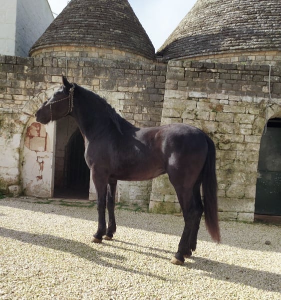 T.F. Proust Tequila An outgoing, very gentle on the hand, and affectionately cheeky – these words best describe Tequila. In the round pen, Tequila pays close attention to his handler and responds to the slightest changes in body language. He is very affectionate towards people, always ready for a little joke ;-). Tequila grew up with some buddies in the herd of the breeder from whom we are now able to offer him. He is familiar with life on a masseria, which means: dogs, guard geese, cows, tractors, and more dogs. He has professionally learned the basics of young horse training and is now looking forward to the next steps in his education with you. Currently, Tequila is not yet castrated but can be done upon request (included in the price) by the breeder. Born in 2023, his estimated final height is around 16.1 hh. If you would like to know more about Tequila – we look forward to your message. X-rays are available and, upon serious interest, can of course be viewed. We will also organize everything else for you – clinical pre-purchase examination, handling of the sales contract, transportation to your home stable, and more. Cavallo Murgese.de – on behalf of and in cooperation with the Italian Murgese Association A.N.A.M.F.