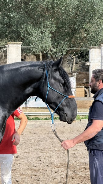 The price includes castration. ~ Sartù TA ~ This beautiful, young Murgese captivates with his strong character and honest nature. He is attentive, intelligent, and has a bit of a mind of his own – a horse that likes to think along and sometimes questions his human. Despite his strong character and curiosity, he is affectionate, cuddly, and very people-oriented. He is always friendly and respectful in handling and seeks his person of reference. He is already familiar with the saddle and is currently in an age-appropriate, gentle basic training, which he participates in motivated and eager to learn. A great partner for anyone looking for a charismatic horse with personality! Currently, he stands at 164 cm. Do you want to get to know Sartù personally? He is still in his homeland in Apulia. He also brings X-rays with him, which can be viewed with serious interest. We are also planning everything else for you - clinical purchase examination, processing of the purchase contract, transport to your home stable, etc. - on behalf of the Italian Murgese Association A.N.A.M.F.