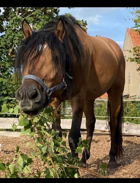 Priority over Price Aramis is a dream horse! If you're looking for an authentic, beautiful Mustang for self-education and a lifelong companion, you've come to the right place. He was bred in Sweden, at the renowned Kiger Mustang breeding farm Monasdotter. Both of his parents are true wild catches! He is registered in the USA with KHAR as well. For us, Aramis is a true family member. We go for walks with him, during which he comfortably carries his saddle and shows no fear in the woods or on the pasture. We also longe him, but the clever stallion finds that a bit boring and quickly loses interest. Aramis learns quickly and enjoys completing tasks that are set for him with enthusiasm. He is curious, well-mannered, and has an absolutely wonderful character. He is a very handsome horse, with good posture and a classic silhouette, complemented by his long, black mane and tail, and the characteristic wild horse markings on his legs. His good looks are only surpassed by his charm. Therefore, Aramis is also very interesting for breeding! Of course, he is regularly dewormed, and hoof care is easily managed with a grinder. What is important to us and him: he is kept in an open stable environment. Aramis has a lung condition, but this does not restrict him in daily life. He receives high-quality hay from us, which does not need to be soaked. Due to circumstances, we have to part with him reluctantly, and a good, caring home is an absolute must for us. Therefore, for us, priority goes to a suitable home over the price! If you're interested, feel free to make us an offer. And if you have any further questions, please don't hesitate to contact us.