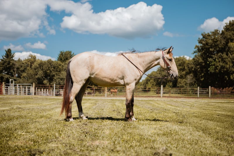 ♦️ 𝐭𝐡𝐞 𝐀𝐌𝐄𝐑𝐈𝐂𝐀𝐍 𝓕𝓪𝓵𝓵 𝓒𝓵𝓪𝓼𝓼𝓲𝓬 ♦️ Happening now thru MONDAY | OCTOBER 20th - Available EXCLUSIVELY on HorseBid's website! For more details and to register visit: www.Horsebid.com CONSIGNOR CONTACT: Schleg Performance Horses 574-806-5327 LOCATION: North Judson, IN BREED: Mustang REGISTERED: No COLOR: Buckskin HEIGHT: 13.2 AGE: 3 GENDER: Gelding JJ is a true Mustang from the west, but don’t let that get in the way of seeing all his amazing talent. He stands 13.2 and is packed full of talent. From his incredible stop to jumping and roping, JJ has been ready and willing to please in anything we have asked him to do. JJ is a very athletic mover, light on his feet and smooth in all gaits. We have used him all over on the farm and taken him to town to see the sights. JJ has been hauled here and there to practice roping pens and rodeos and handles all the commotion and chaos like a champ. He is light in your hands and on your leg, giving to the bridle and easily moves shoulders, hips and side passes. Out on the trail JJ has crossed rivers and streams, tread through the mud, climbed up and down hills and crossed over logs. He is easy going whether he’s in the front of a group, in the middle or brining up the rear.JJ loads great and hauls well. He has been hauled to several over night camping trips and stands quiet at the hitching rail. We have rode JJ many miles in both English and western tack. Here at the farm, JJ lives out on a lot with a couple other horses. He is not a bully to other horses but also not on the bottom of the pecking order. He is a super easy keeper and requires no maintenance. He is easy to catch outside and when stalled, JJ is very mannerly and easy going. In and out of the arena JJ has easy gaits, smooth transitions and he guides well on a neck rein. JJ has been my go to ride most of this year, and I’m sure that once you swing a leg over him you’ll understand why.